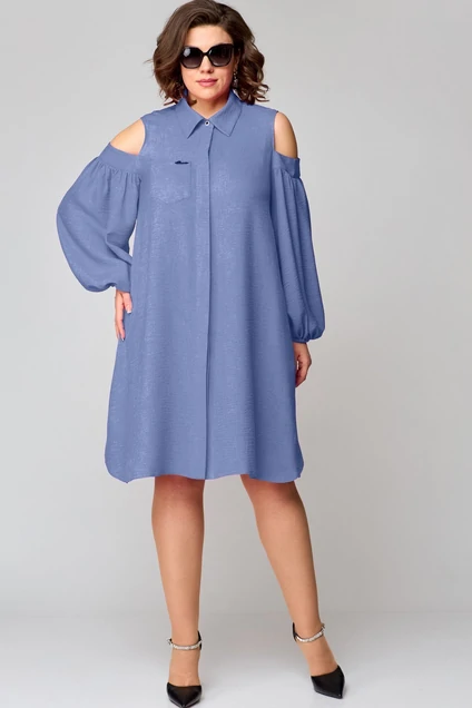 Платье женское нарядно-повседневное А-образного силуэта выполнено из плательной ткани. Вырез горловины воротник на стойке рубашечного типа. Застежка потайная доверху на обметанные петли и пуговицы. Рукав втачной с открытым плечом со сборкой по вурху и по низу. Низ рукава собран на резинку. В боковых швах обработаны карманы т разрезы. По правой полочке накладной карман. Декором служит съемный пояс и декоративный элемент на кармане в качестве отдели. Низ платья фигурный..
