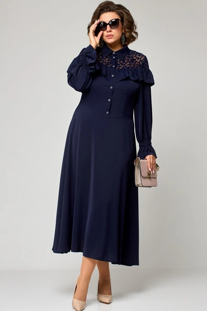 Платье нарядное, выполнено из плательной ткани в сочетании с сеткой с набивным принтом. Платье прилегающего силуэта с фигурным подрезом по линии талии, юбка расширена к низу. Вырез горловины воротник на стойке рубашевчного типа, застежка - планка до талии. Рукав втачной широкий по низу собран на резинку создавая волан.Декором платья служат вставки из сетки по полочке и рукавам, рюши по полочке и рукавам из основной ткани и отделочные декоративные пуговицы.