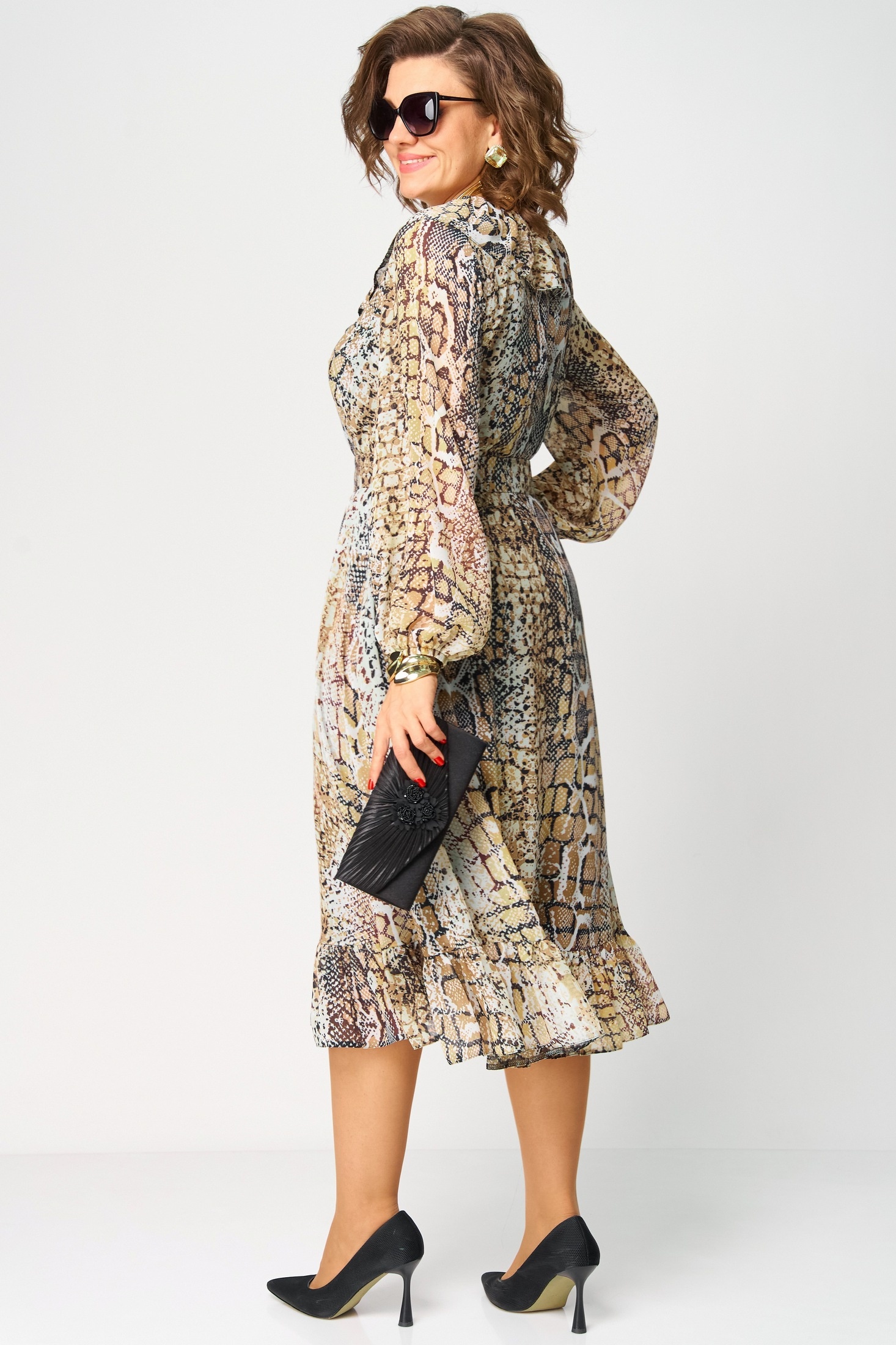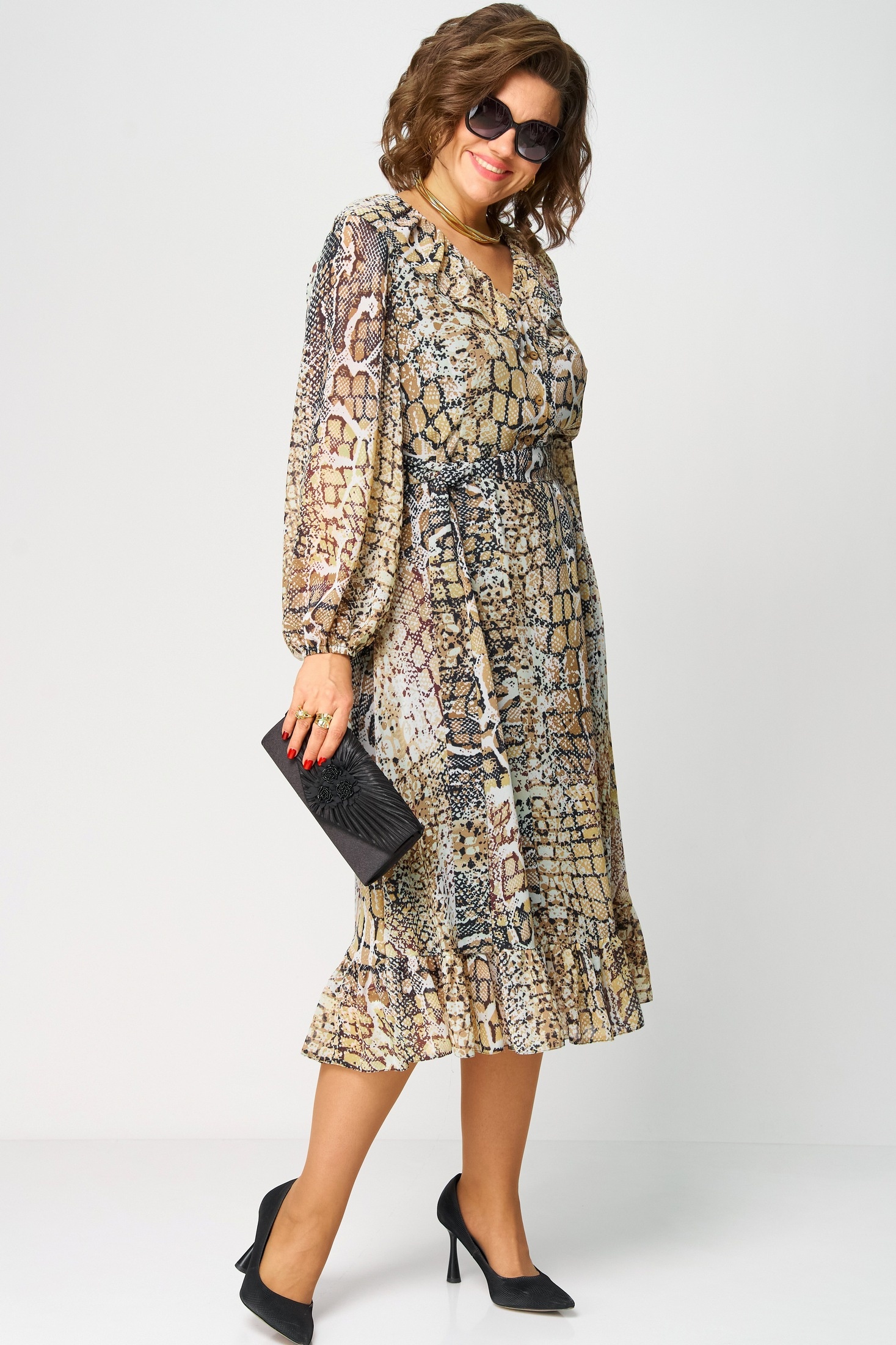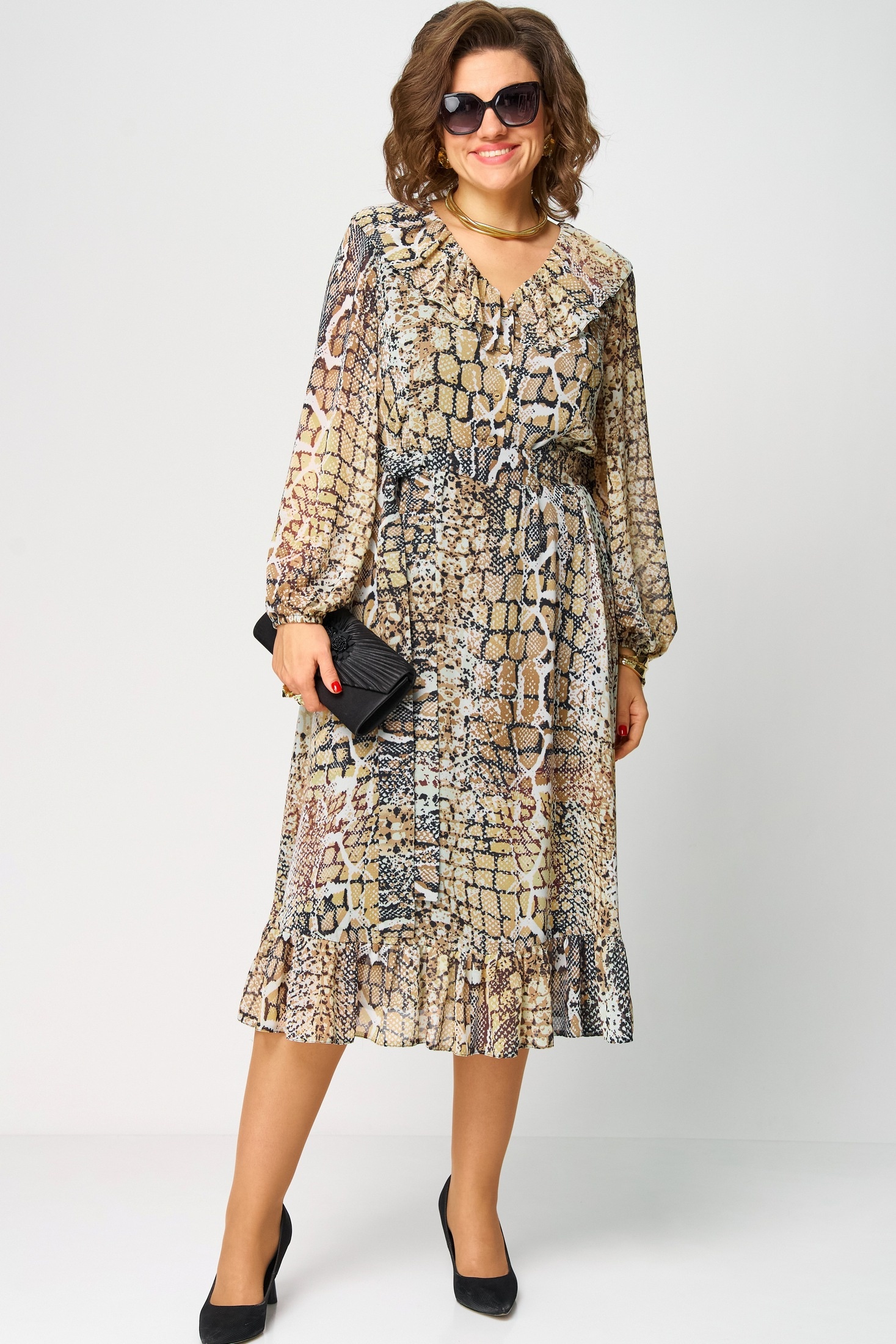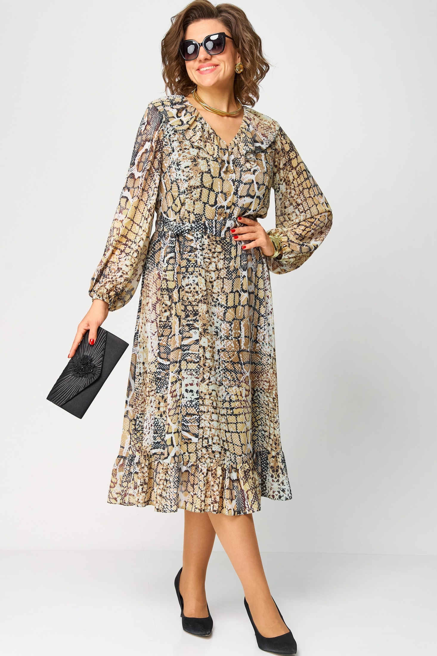 Платье 7327А рептилия от EVA GRANT — это идеальное сочетание стиля и комфорта. Коллекция бренда EVA GRANT предлагает легкие и воздушные платья из креп-шифона с эффектным анималистичным принтом, который подчеркнет вашу индивидуальность. Полуприлегающий силуэт с расширением к низу дополняется отрезной талией и рюшей по линии горловины, создавая элегантное и женственное очертание. Длинные втачные рукава на резинке добавляют практичности, а съемный пояс акцентирует вашу талию. Этот классический вечерний наряд подходит для теплого сезона, будь то вечерние мероприятия или праздничные выходы. Основной цвет — модный рептилийный узор, который прекрасно впишется в ваш гардероб.