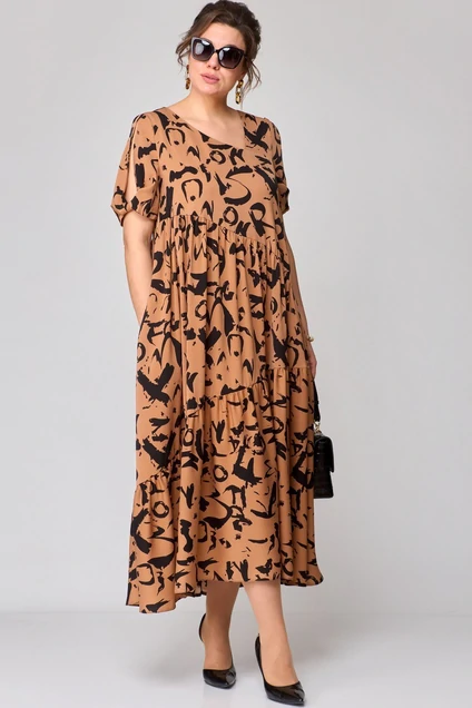 Платье женское наряно-повседненое свободного силуэта. Выполнено из плательной ткани. Вырез горловины фигурный, обрабоан отчкой, рукав втачной короткий с перекрутом по низу. По плочке и спинке платя ассиметричне подрезы со сборкой. В боковых швах обработаны карманы. По спинке платье чуть длинее чем по полочке. Декором платья служит дизайн самой ткани.