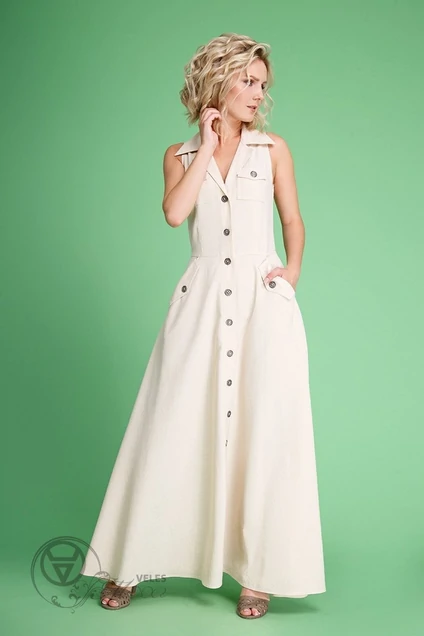 Платье выполнено в романтичном стиле из плательной ткани, верх изделия полуприлегающий декорирован накладными карманами с клапанами. Юбка расклешенная (полусолнце), по боковым юбки карманы декорированы клапанами. Застежка- планка (петля пуговица). Длина изделия -160 см.