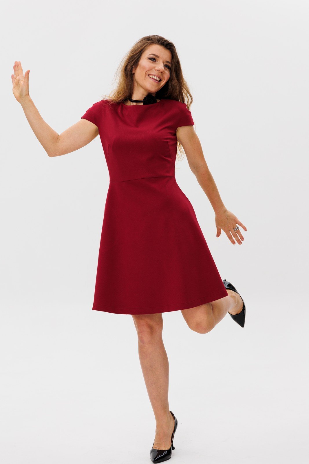 Элегантное короткое платье бордового цвета - идеальный выбор для женственного образа. Особенности дизайна включают удлинённые спущенные плечи и короткие рукава, добавляющие стильный акцент. Платье оснащено талиевыми вытачками, которые заметно подчеркивают талию, а юбка плавно расширяется к низу, создавая игривый и изящный силуэт. Застежка-потайная молния на спине обеспечивает лёгкость надевания и снимания. Длина изделия позволяет акцентировать ноги, сохраняя при этом элегантность и утонченность. Это платье – прекрасный выбор для сочетания красоты и комфорта.