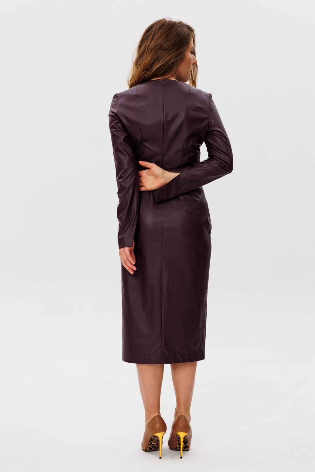 Элегантное платье красивого тёмно-фиолетового цвета - идеальный выбор для стильного образа. Платье выполнено из гладкой ткани с лёгким блеском, что придает ему изысканный вид. Дизайн изделия включает в себя прилегающий силуэт, который визуально стройнит фигуру, и длину ниже колена с удобным разрезом сбоку, добавляющим изысканности образу. Длинные рукава и круглый вырез горловины делают его подходящим для прохладной погоды или вечерних мероприятий. Это платье - отличный выбор для женщин, которые ценят утонченность и комфорт.
