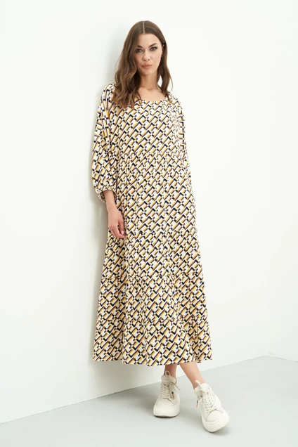 Нижняя часть платья оформлена в виде четырёх воланов с лёгкой сборкой по линии притачивания.