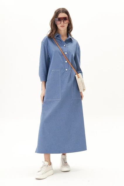 Платье свободного А-силуэта, рубашечного покроя с заниженной линией плеча, рубашечным воротником и рукавом.