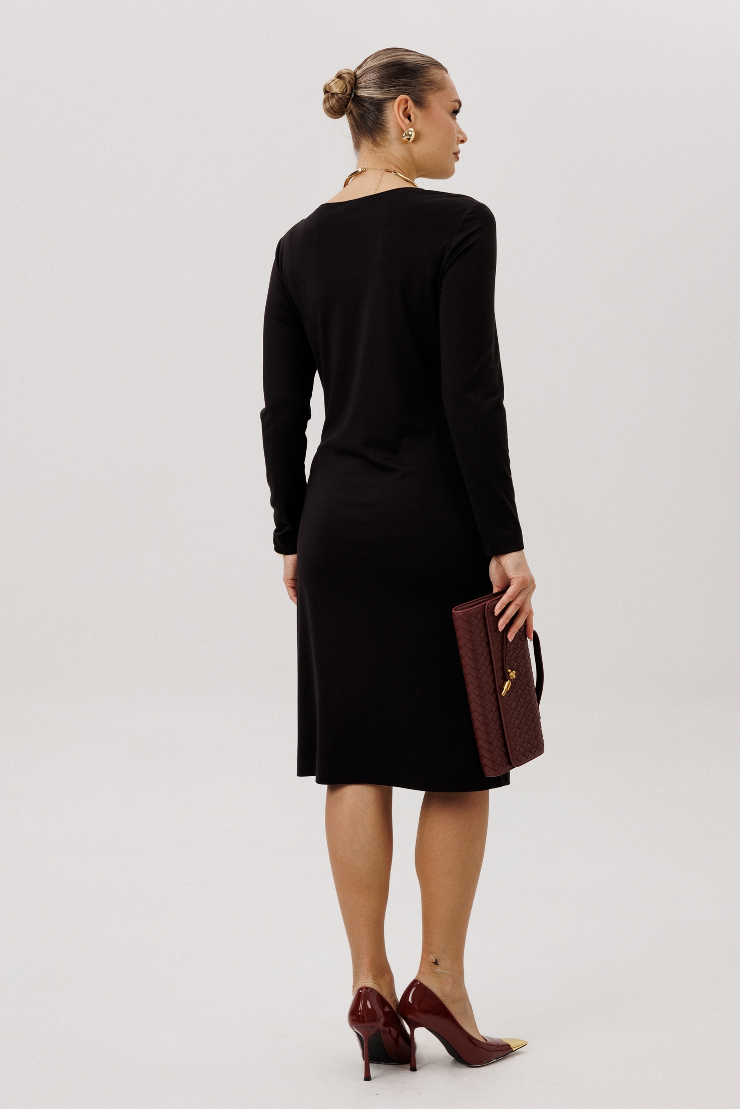 Платье полуприлегающего силуэта, втачного покроя с круглым вырезом горловины и длинным рукавом. Комфортное вискозное полотно, средняя длина. Полочка с центральным швом и ассиметричным поясом-завязкой, образующим драпировку на правой половине. Рукав одношовный.