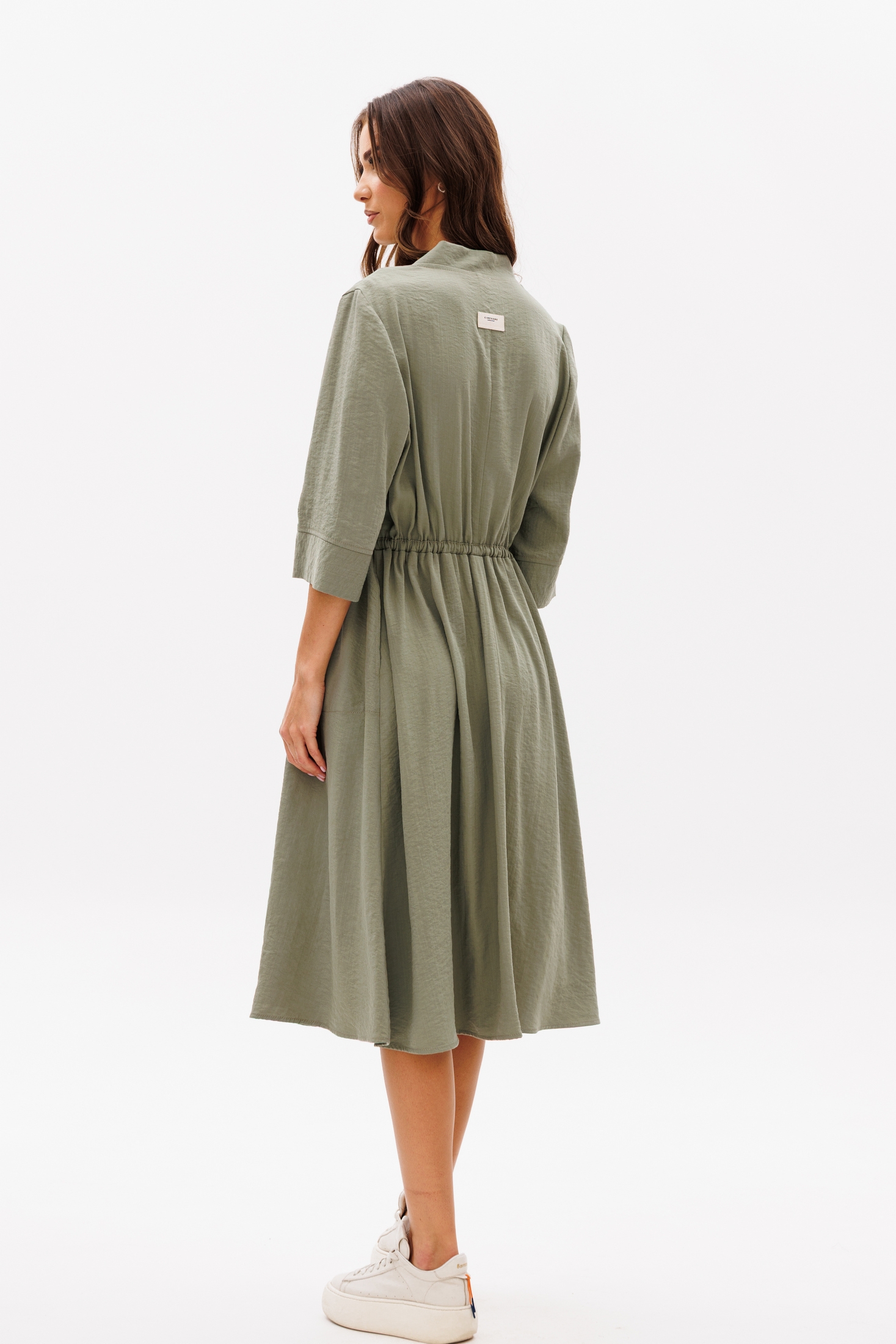Изысканность и элегантность такого платья дарит своей обладательнице эффектный образ. Полуприлегающий силуэт, втачной покрой, отрезной лиф и коническая юбка. Полочка лифа с центральной застежкой на петли и пуговицы, втачным воротником, имитирующем стойку с фигурной линией втачивания, и мягкой складкой-вытачкой.
