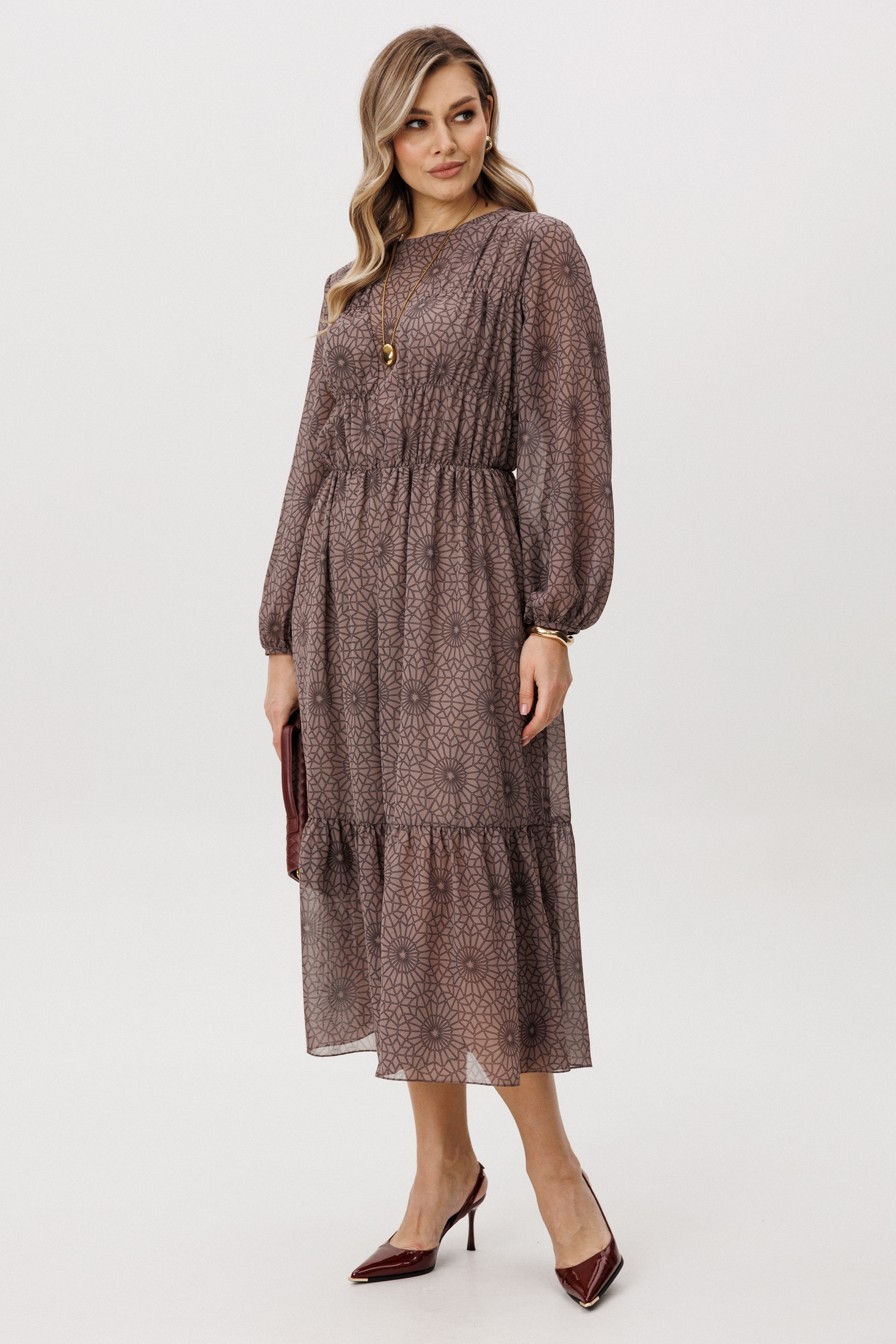 Платье 5126 светлый FantaziaMod — это идеальное воплощение стиля и комфорта. Коллекция бренда FantaziaMod предлагает легкое, воздушное платье из шифона, которое подарит вам ощущение свежести и легкости в любое время года. А-силуэт добавляет женственности, а геометрический принт подчеркивает вашу индивидуальность. Идеально подходит для повседневного гардероба и романтических прогулок. Платье оформлено с эластичной тесьмой по линии талии и легкой сборкой, что обеспечивает комфортную посадку. Длина миди и длинные рукава создают классический и элегантный вид. Отличный выбор для весенне-летнего сезона. Светлый оттенок добавит свежести и лёгкости вашему образу.