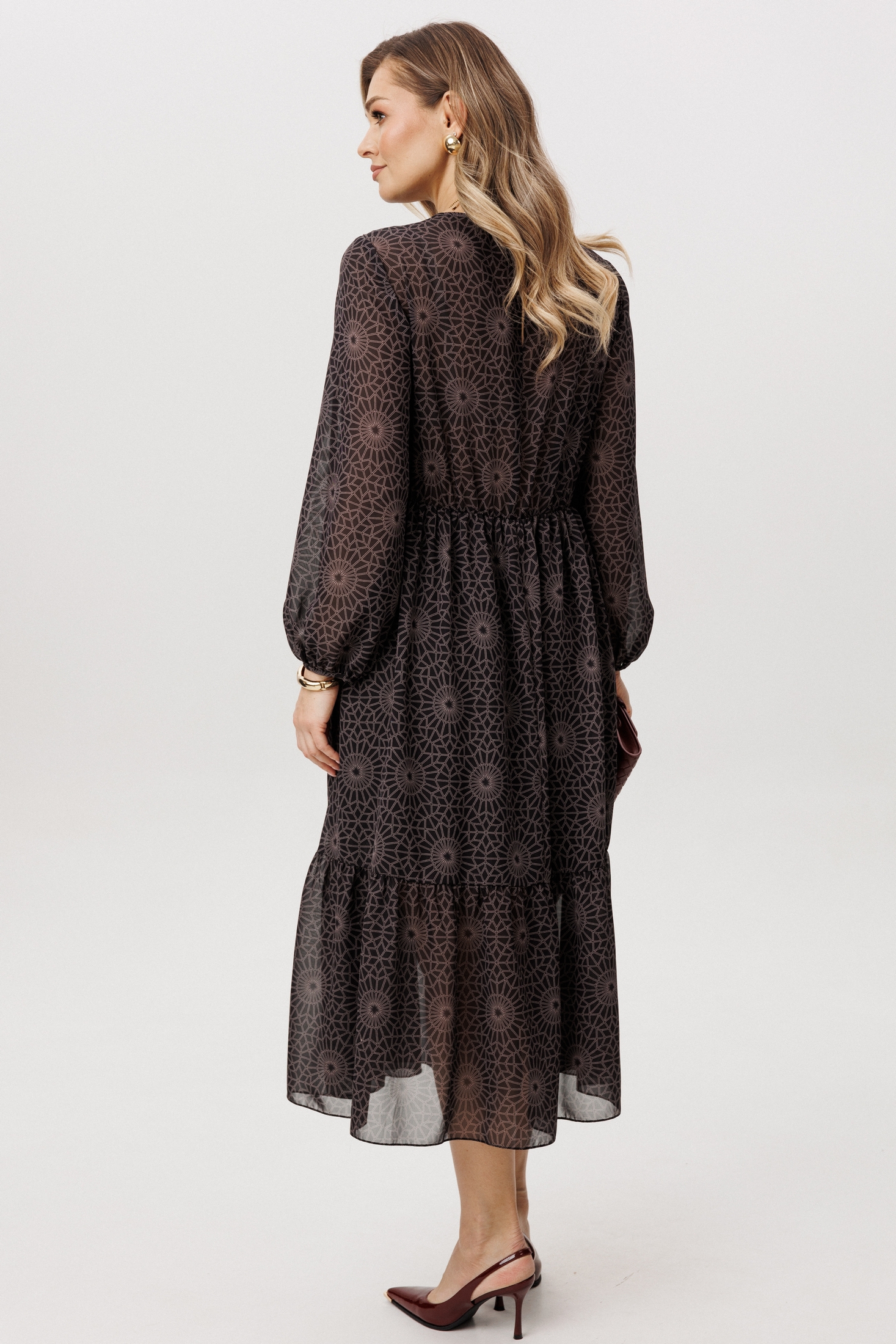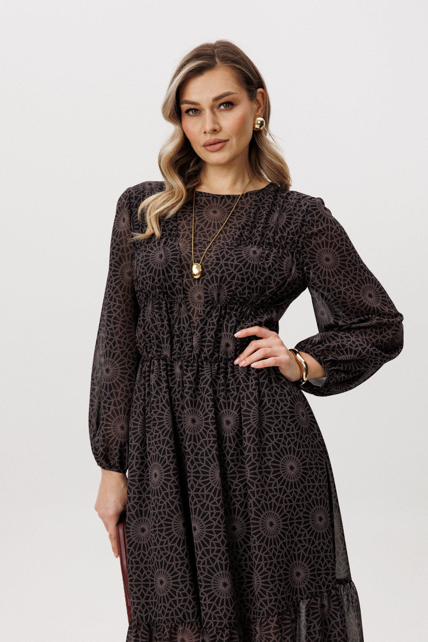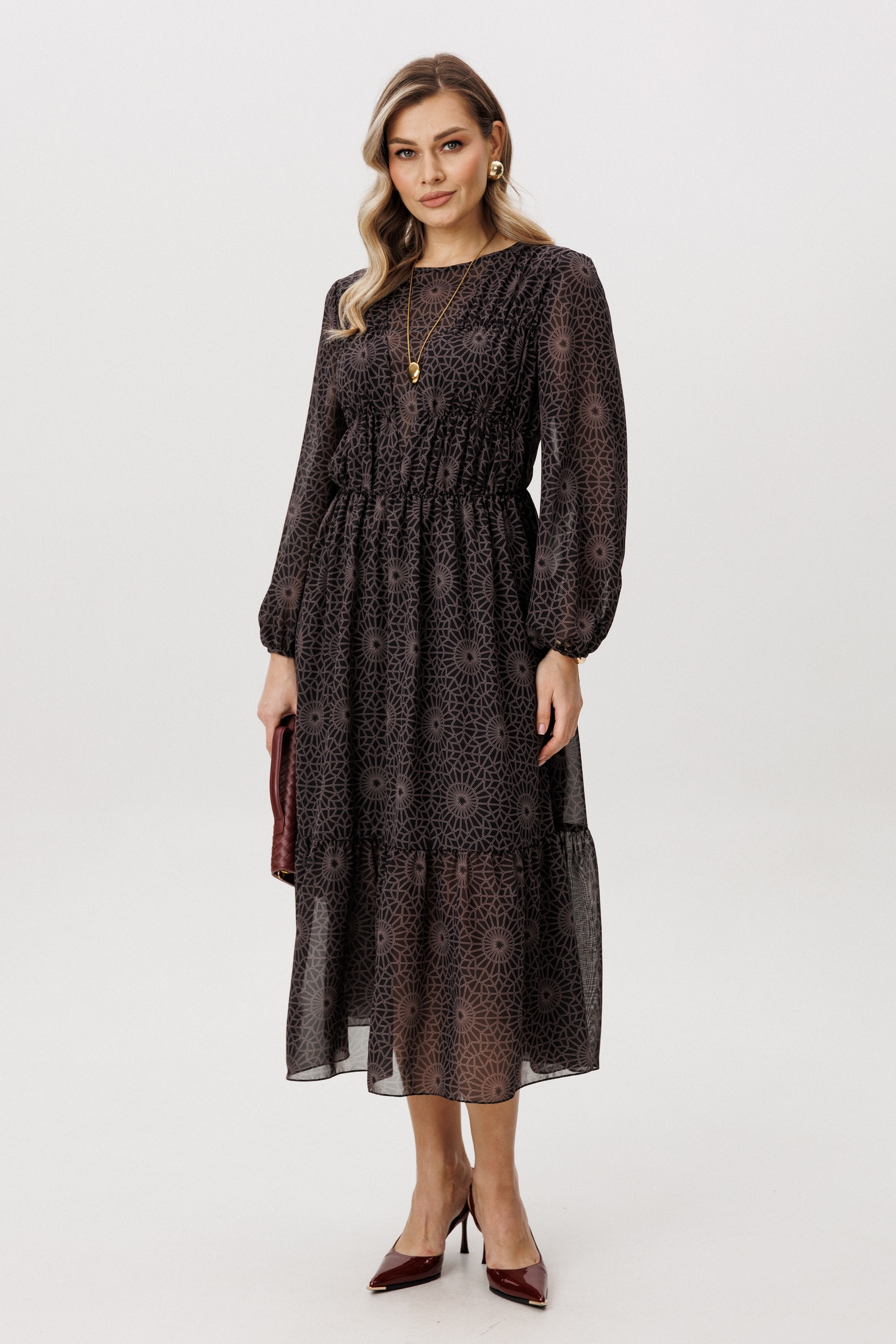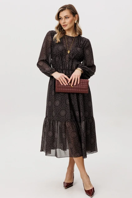 Платье 5126 темный FantaziaMod из коллекции бренда FantaziaMod — это воплощение элегантности и комфорта. Выполненное из легкого шифона, оно имеет геометрический принт, добавляющий изысканности в повседневный образ. А-образный силуэт и длина миди сочетаются с втачными рукавами 3/4 и круглым вырезом, создавая плавные линии. Подрезы на лифе и сборка по талии подчеркивают женственность. Темный цвет придаёт универсальности, позволяя легко адаптироваться к любому случаю. Это платье идеально подходит для весны и лета, и станет прекрасным выбором как для офиса, так и для вечернего выхода.
