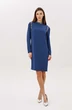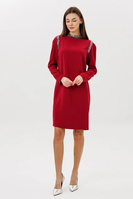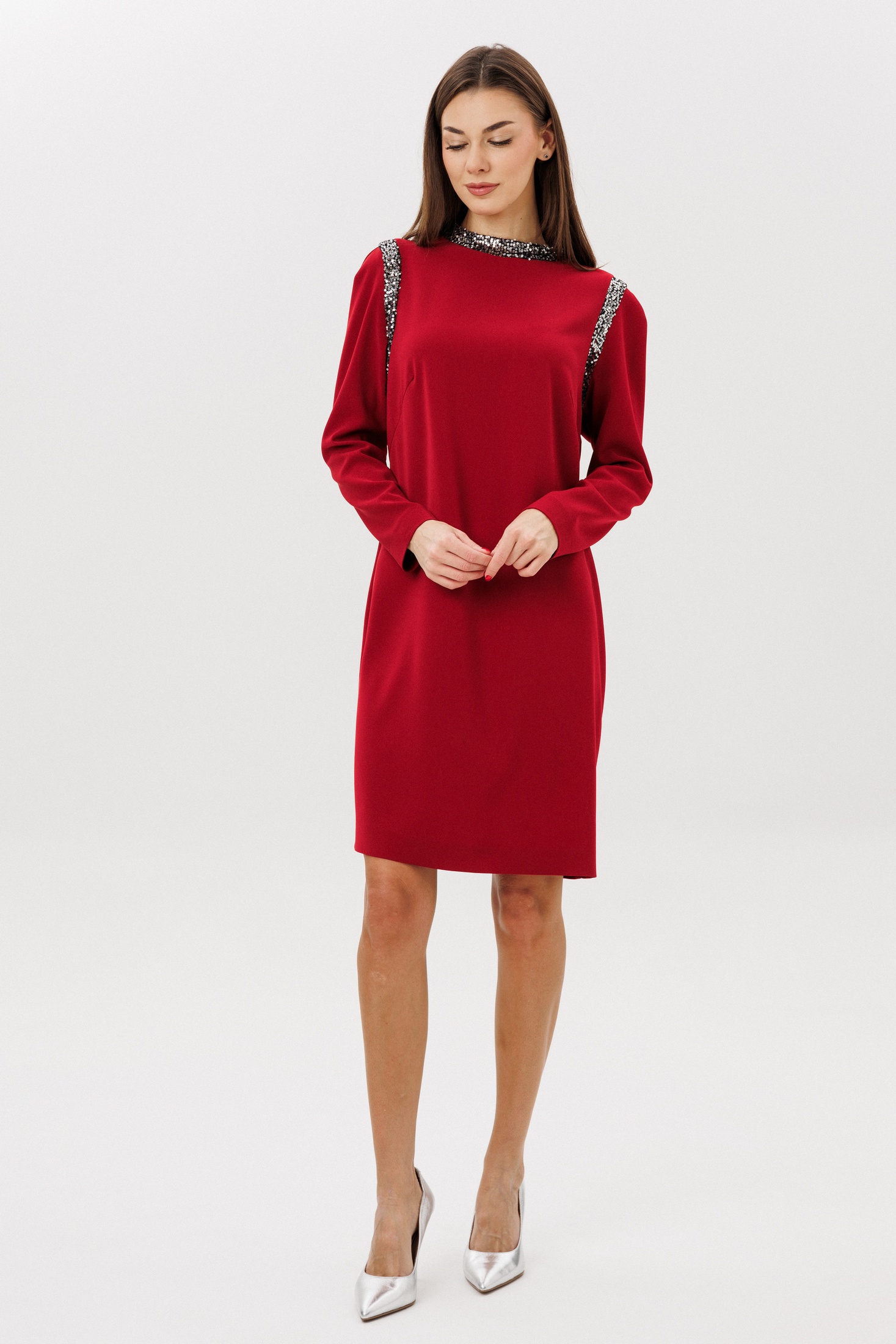 Свободный упрямленный силуэт, покрой-полуреглан, воротник-стойка, застежка по центру спинки на потайную молнию. По линиям пройм на полочке и спинке, стойка из отделочного полотна в пайетку. Полочка с нагрудной вытачкой. Длина платья около 100 см. Длина рукава около 62 см.