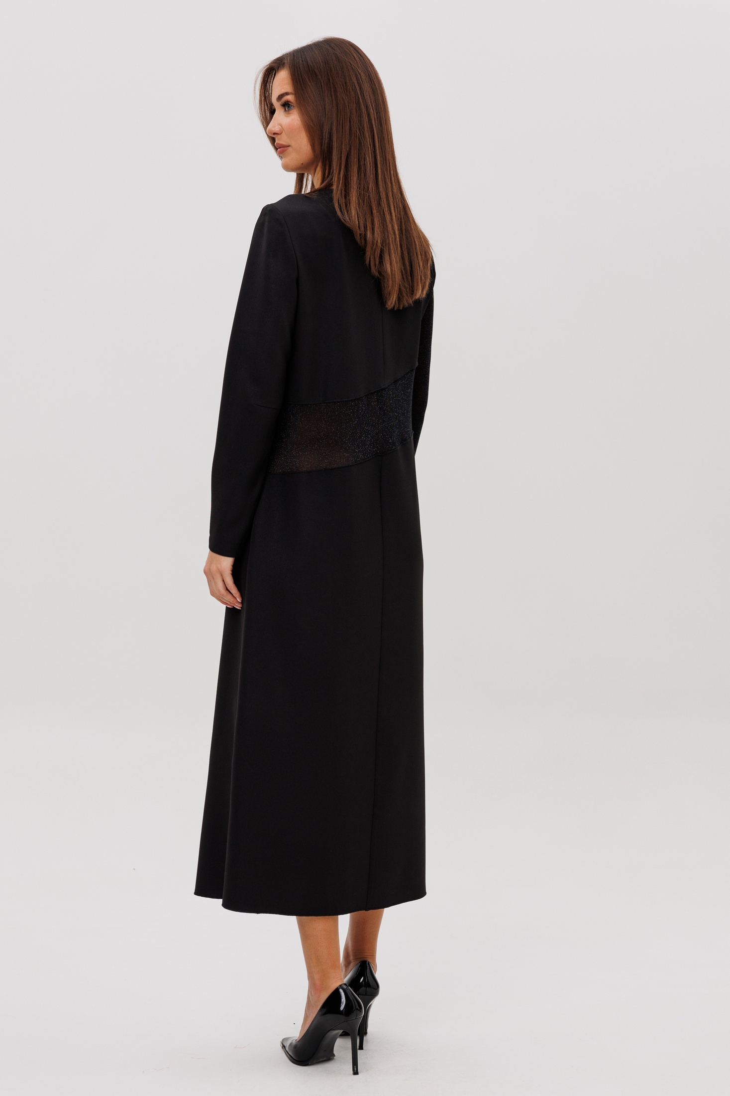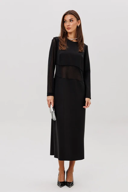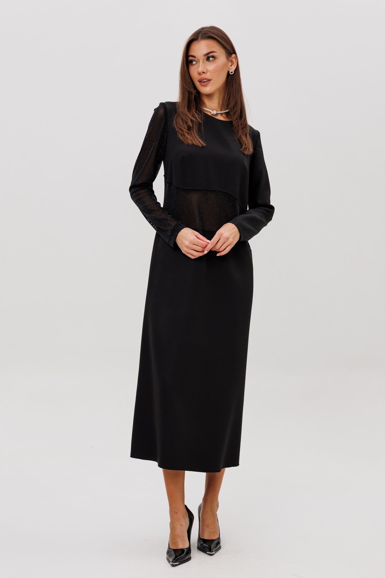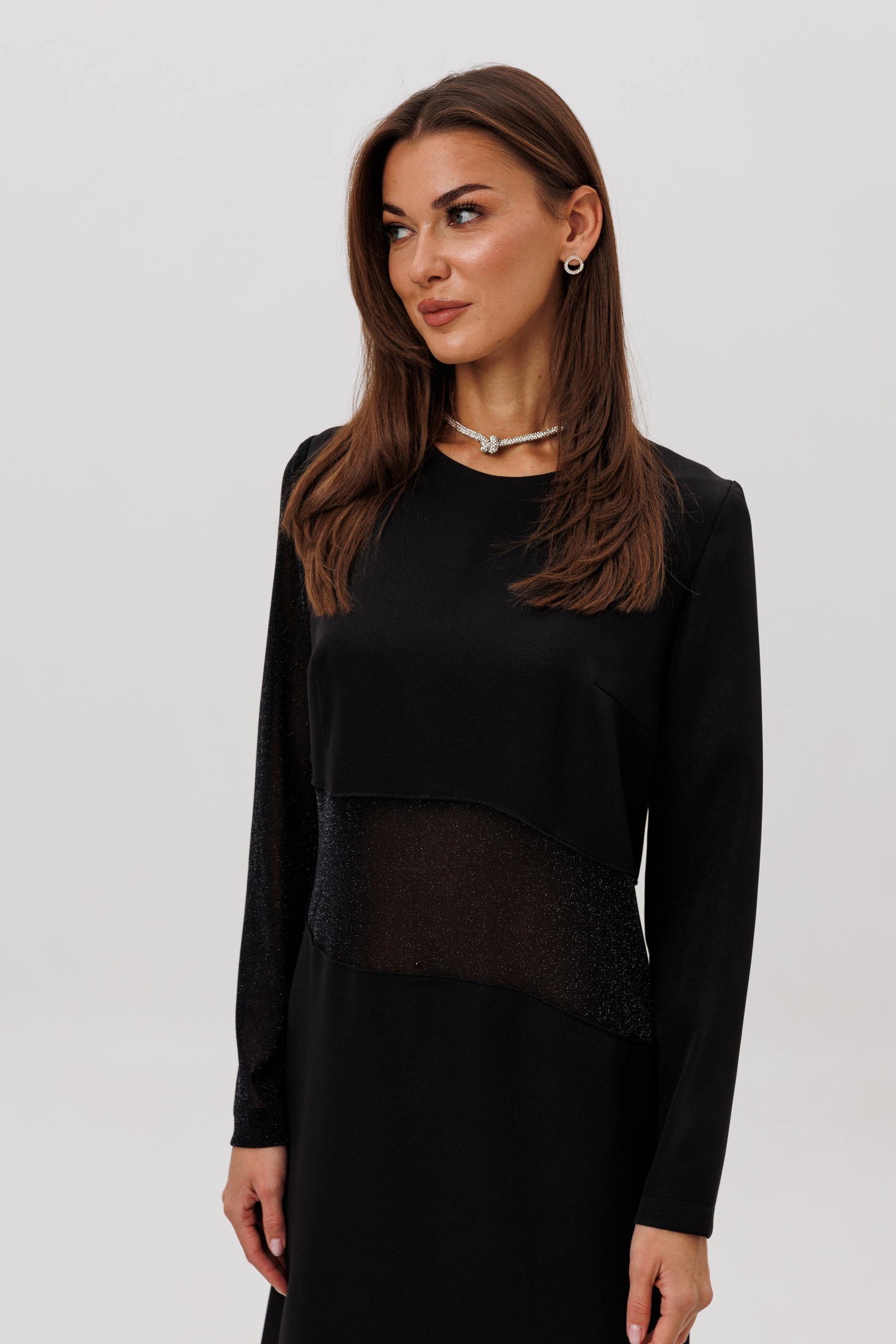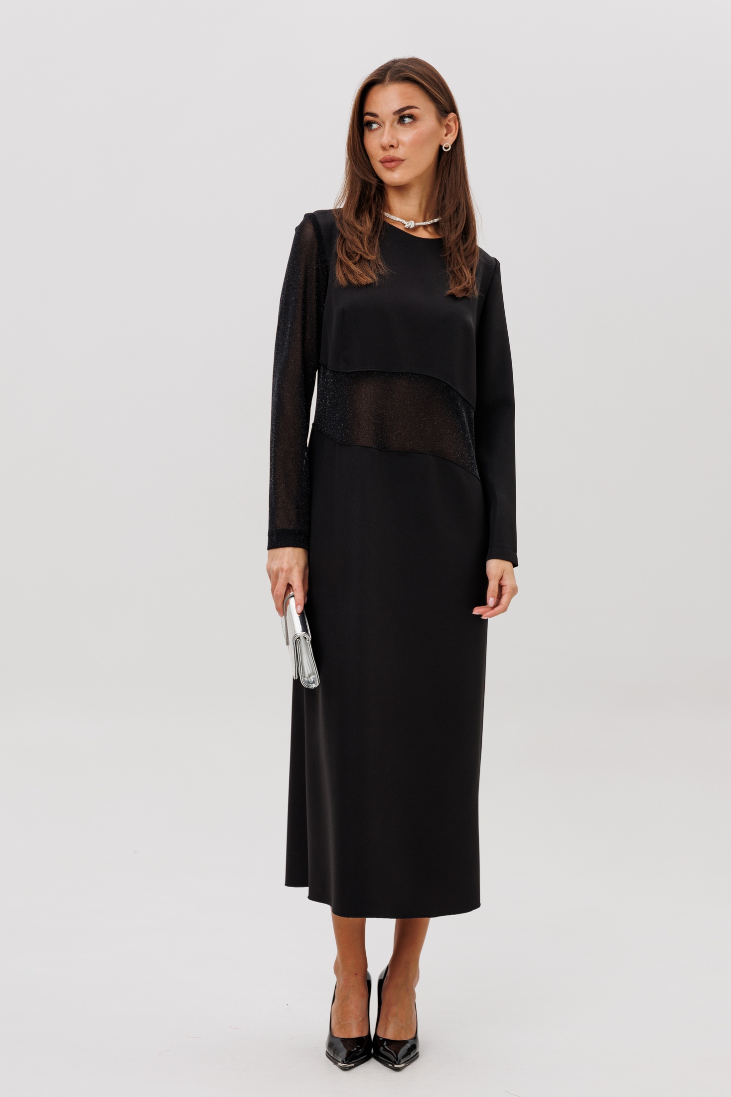 Главный акцент модели — сочетание разных фактур: полупрозрачный рукав и асимметричная вставка из мерцающей сетки создают лёгкий «вуальный» эффект, добавляя образу загадочности и современного шика.