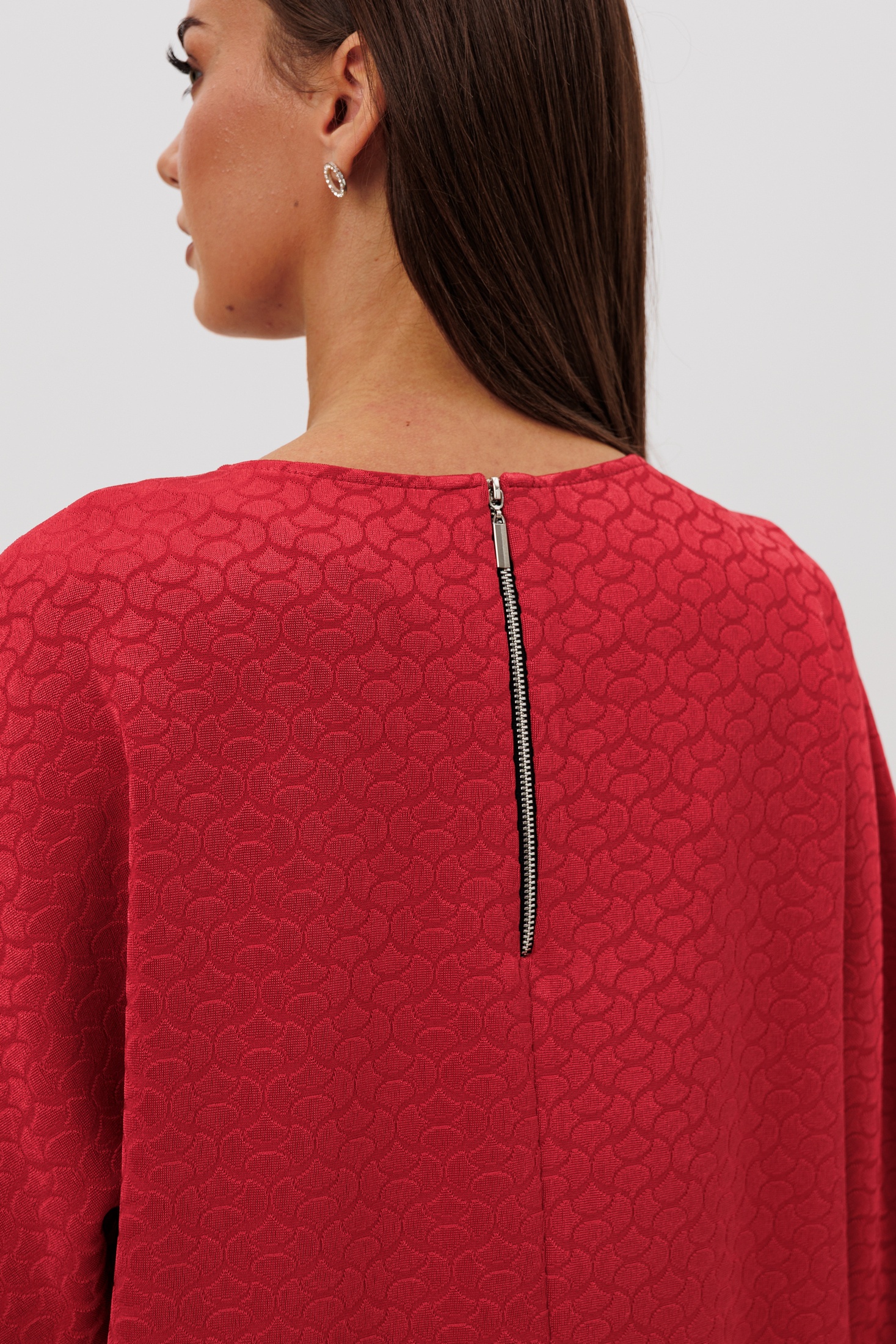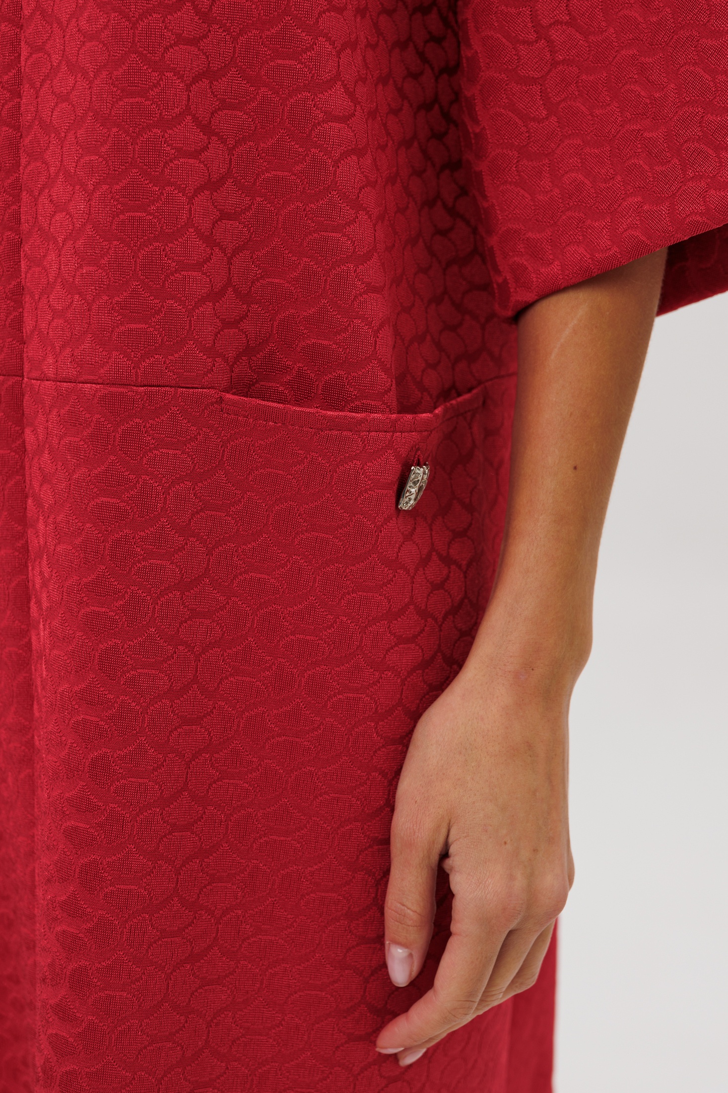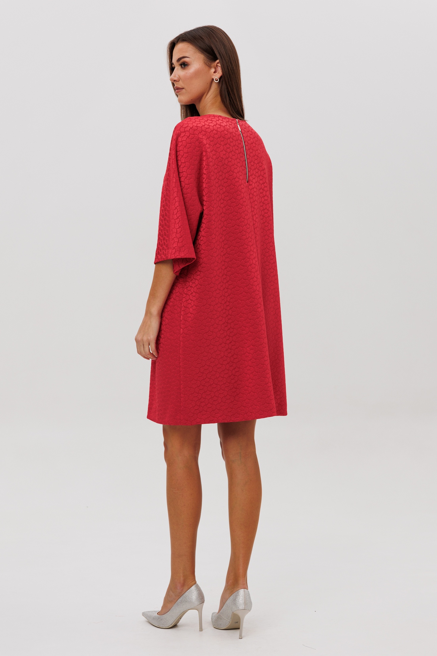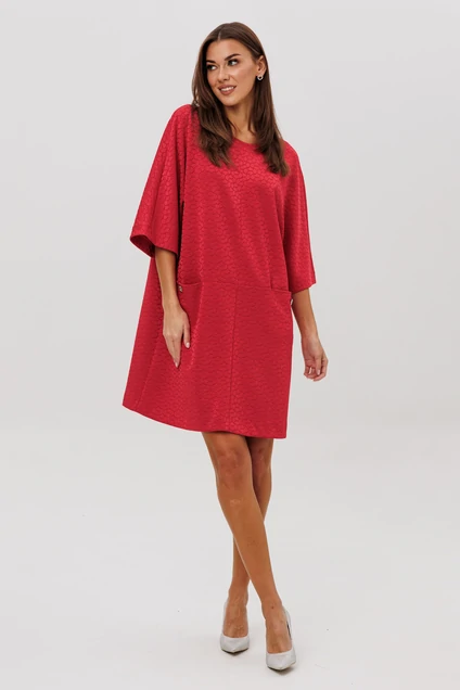 Элегантное красное платье выполнено из жаккардового трикотажа, предлагая идеальную смесь комфорта и структуры. Особенностью ткани является её фактурное плетение, благодаря чему полотно хорошо держит форму и создаёт чистый силуэт. Платье имеет свободный крой, функциональные карманы, что добавляет изделию расслабленную лёгкость. Короткие рукава и минималистичный дизайн делают эту модель универсальным выбором для создания современного и уверенного образа.
