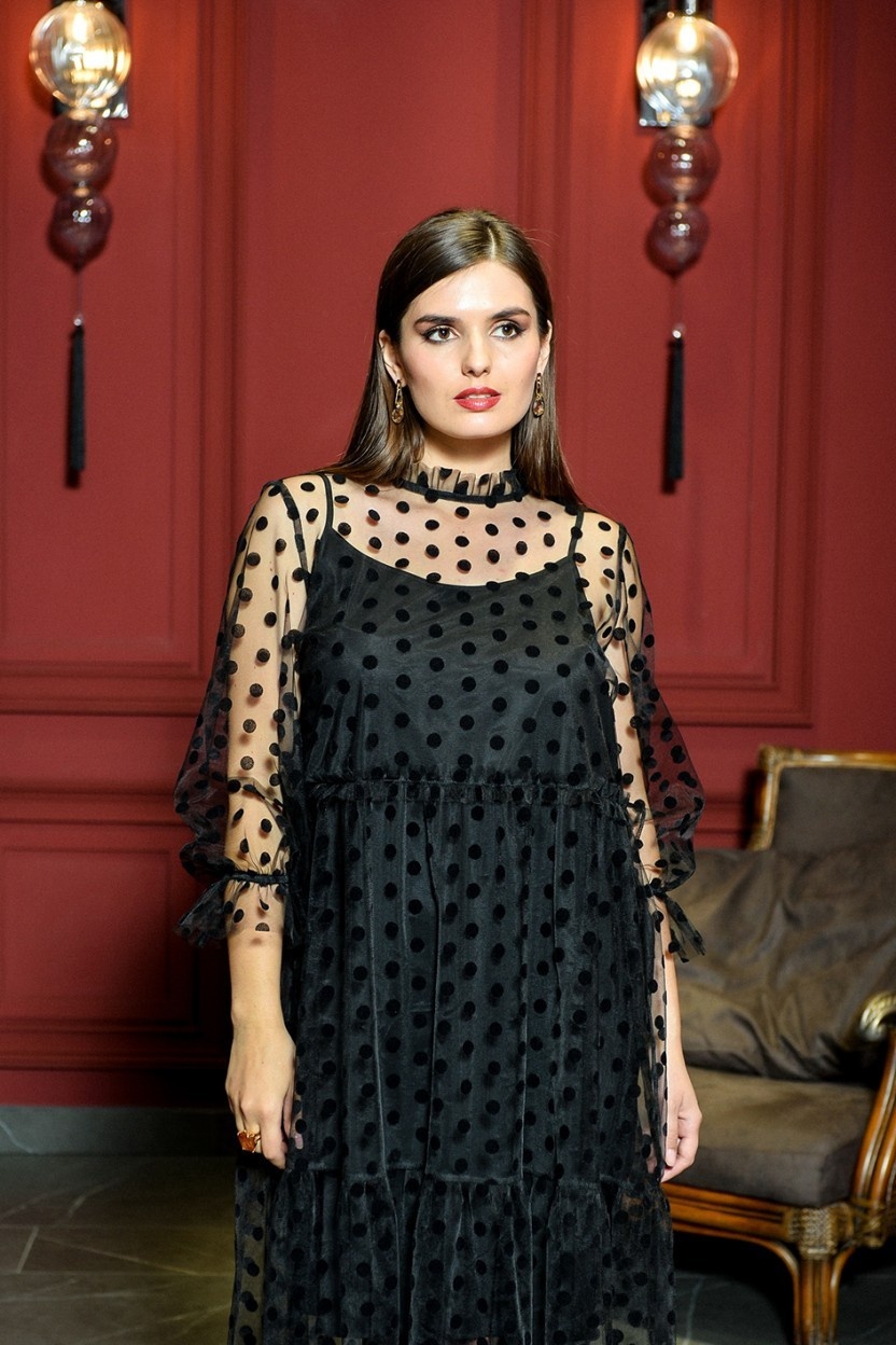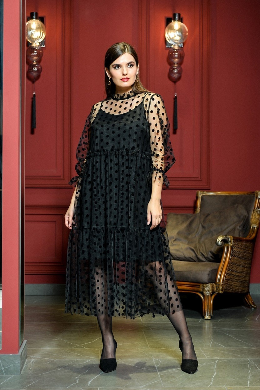 Элегантное черное платье с принтом в горох, выполненное из двух видов ткани, идеально подойдет для торжественных мероприятий. Сетчатый верх добавляет изысканности и игривости, покрывая нижнее короткое платье длиной до середины бедра. Длина верхнего платья составляет 124 см по среднему шву спинки, гарантируя элегантную длину миди. Рукава длиной 59 см на резинке обеспечивают удобство и свободу движений, а стойка на воротнике добавляет акцент на изящной шее. Застежка петля-пуговица сзади не только функциональна, но и добавляет деликатного шарма. Свободный крой платья обеспечивает комфортное прилегание для любого типа фигуры. Это платье станет прекрасным выбором для тех, кто ценит классику с современным акцентом в деталях.