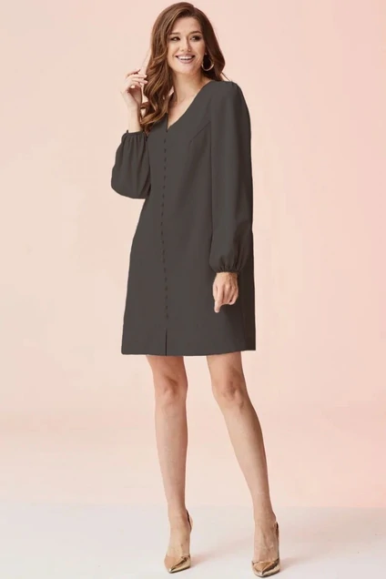 Элегантное платье А-силуэта, выполненное из качественной плательной ткани темно-серого цвета, прекрасно подойдет для создания рафинированного образа. Модель с длиной по среднему шву спинки 90 см обладает глубоким V-образным вырезом, который дополнен рядом декоративных пуговиц по передней планке, придающих изделию особый шарм. Длинные втачные рукава на резинке обеспечивают комфорт и свободу движений. Платье на подкладке для дополнительного удобства. Это универсальный выбор, который подходит как для офиса, так и для вечернего выхода.