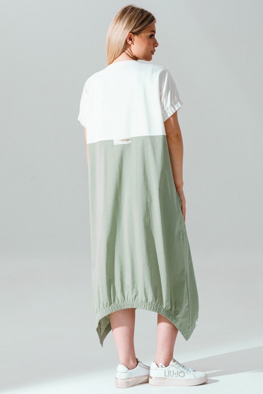 Платье из двух видов ткани- трикотажа и хлопка. Горловина с притачной бейкой и декоративной нашивкой. По переду платья- фигурная хлопковая вставка, переходящая в карманы, и съемный пояс. Низ платья разной длины, на обтачке с резинкой. По спинке платья- декоративная нашивка.