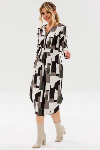 Элегантное платье средней длины из мягкого трикотажа обеспечит комфорт и стильный внешний вид на протяжении всего дня. Модель выполнена в полуприлегающем силуэте, который подчеркивает фигуру, сохраняя при этом свободу движений. Фигурный вырез горловины добавляет изысканности образу. Особенностью дизайна является оригинальный геометрический принт в темно-серой, светло-серой и белой цветовой гамме. Длина изделия по спинке составляет 114 см, а длина рукава — 61 см, что обеспечивает покрытие рук. Рукава втачные, создают элегантный силуэт. На полочке платья предусмотрена вставка и сборка, что придает изделию нежный объем. Спинка собрана на широкую резинку по поясу, благодаря чему платье отлично садится по фигуре. Удобные карманы в боковых швах делают модель практичной в носке. Низ платья фигурно обработан, добавляя изысканности. Это платье — прекрасный выбор для современной женщины, ценящей удобство и стиль в одежде.