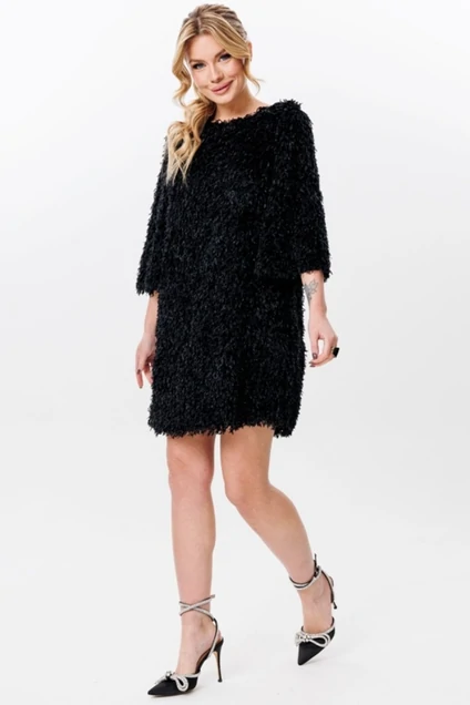 Элегантное черное платье из фактурного трикотажа с имитацией перьев. Модель имеет округлый вырез горловины спереди и соблазнительный V-образный вырез на спинке, подчеркивающий изящество силуэта. Платье прямого кроя дополнено тремя четвертными рукавами, делая акцент на беззаботной роскоши и комфорте. Идеальный выбор для торжественных мероприятий или вечерних выходов.