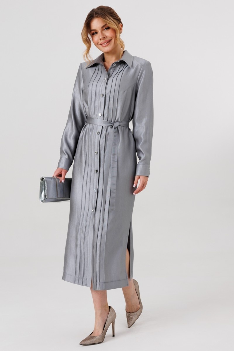 Элегантное платье прямого силуэта из плательной ткани с блеском. Модель оформлена в спокойном серебристом оттенке. Характерной чертой дизайна является рубашечный воротник, добавляющий образу официальности. Платье застегивается на пуговицы по всей длине, а наличие карманов в боковых швах сочетает в себе удобство и функциональность. Эта модель идеально подойдет для создания стильного и утонченного образа.