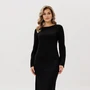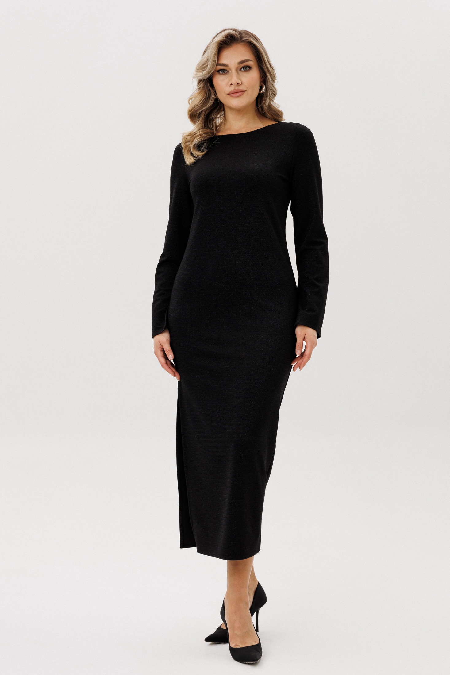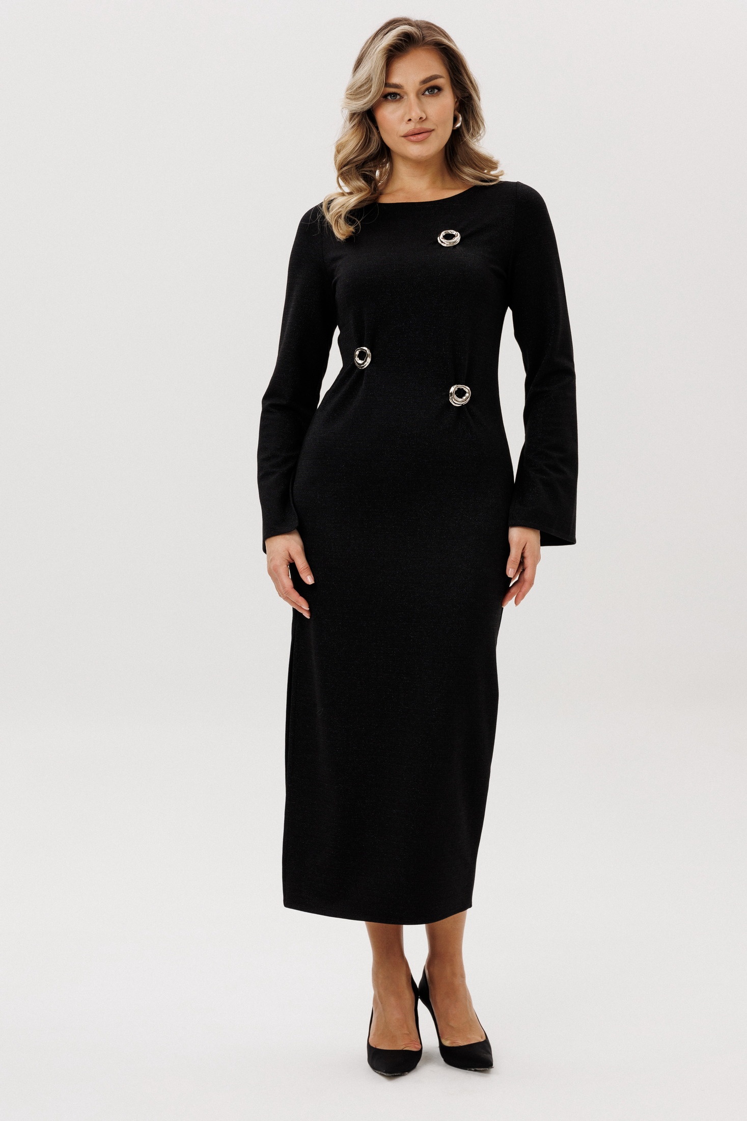 Элегантное черное платье миди представляет собой идеальное сочетание стиля и комфорта. Изготовленное из мягкого трикотажа, это платье благодаря своему прямому силуэту идеально подходит для различных типов фигур. Округлый вырез горловины добавляет нежности образу, а длинные рукава подчеркивают его элегантность. Особое внимание заслуживают съемные броши, которые позволяют варьировать образ: их можно расположить на талии для создания более выраженной фигурности. Платье не имеет яркого принта, сохраняя классическую монохромность, что делает его универсальным выбором для любых мероприятий.