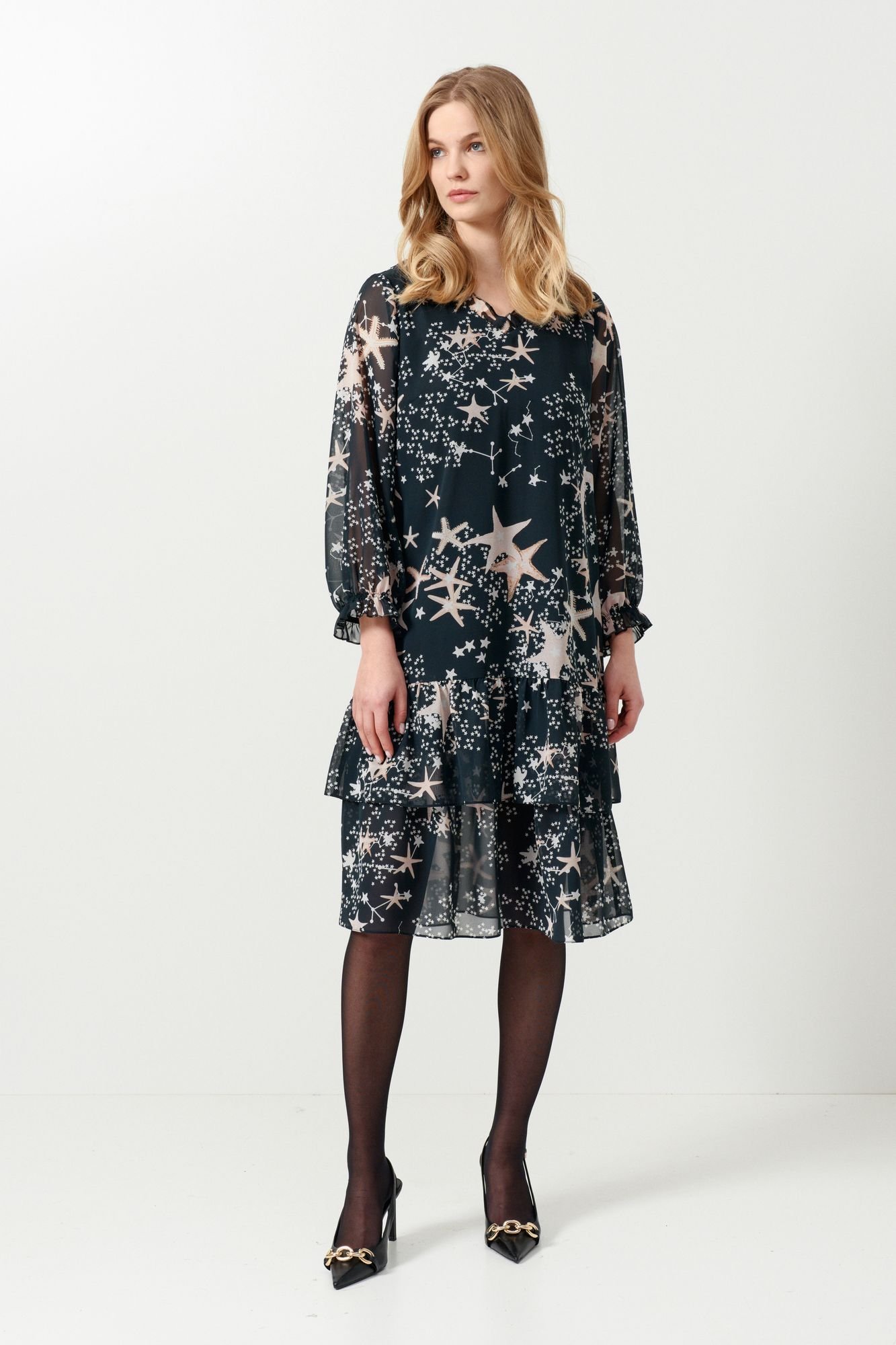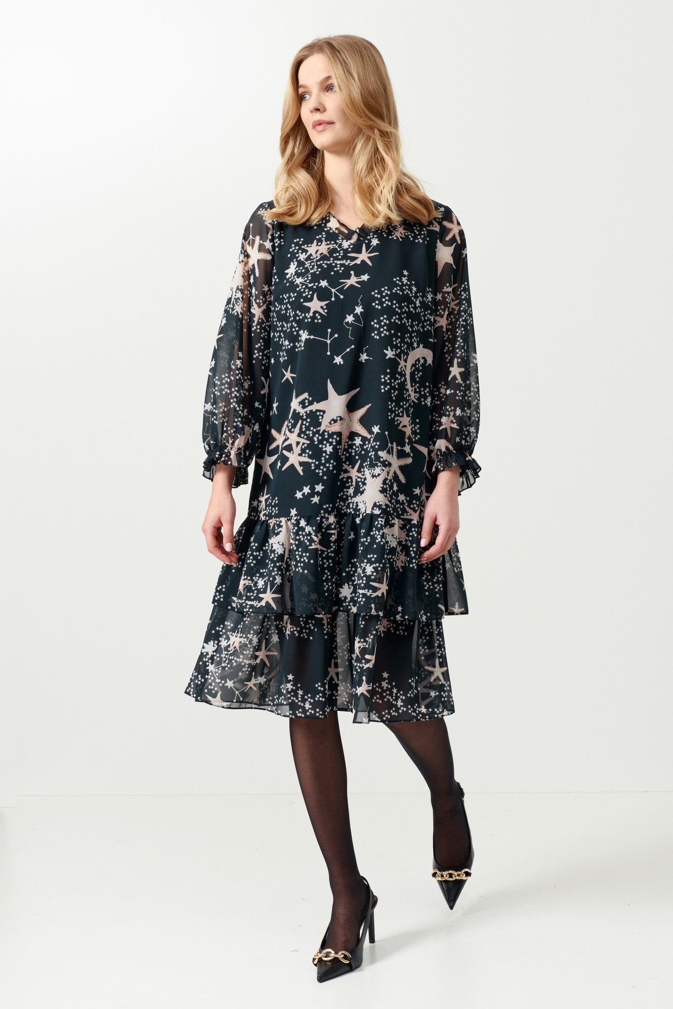 Нарядное свободного кроя, выполнено из шифона, на подкладке. Горловина V-образной формы украшена рюшей. Рукав втачной одношовный, свободный со сборкой на резинку по низу. По полочке нагрудные вытачки. Ниже линии бёдер волан, второй волан притачан к подкладке платья.