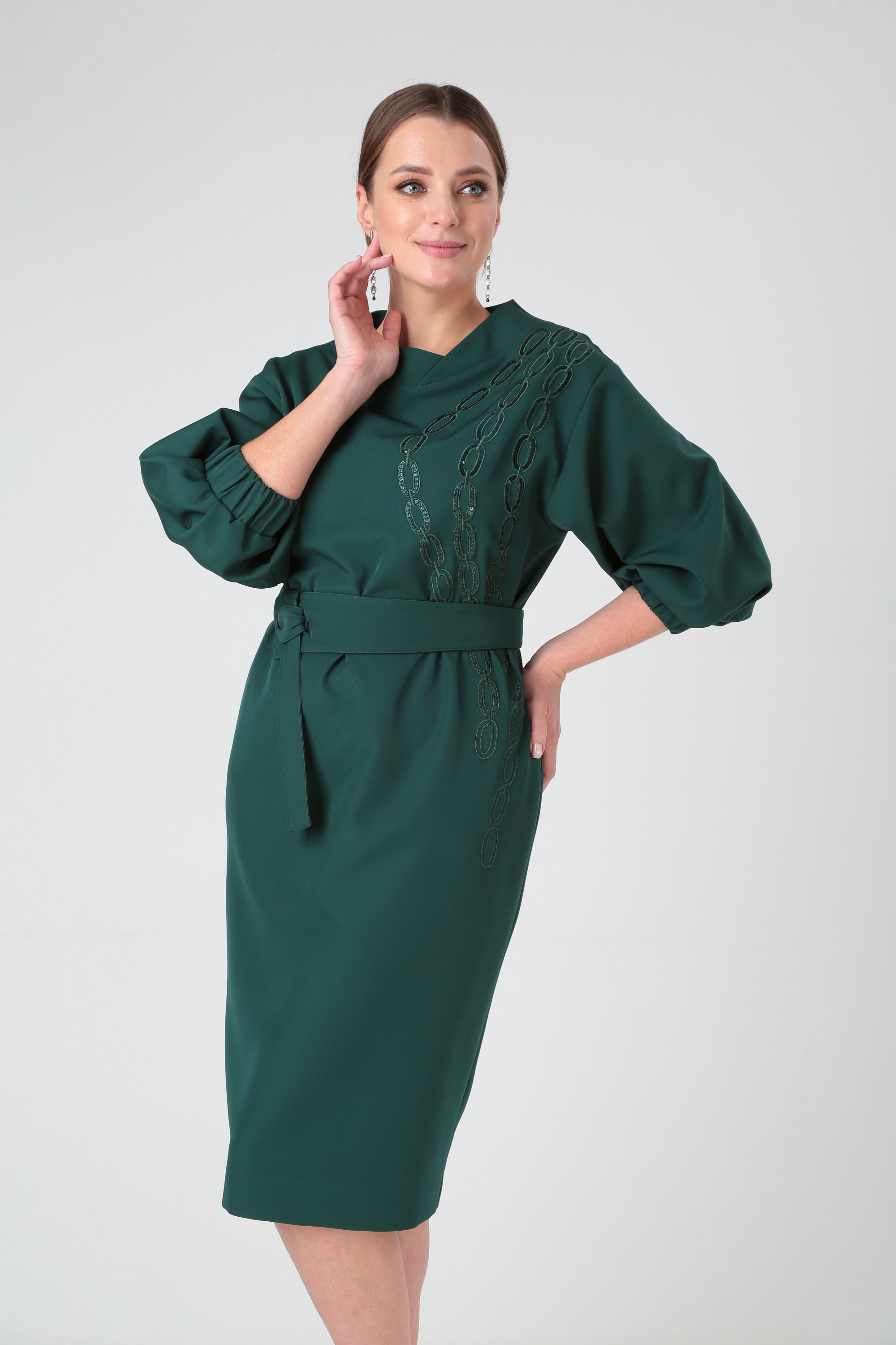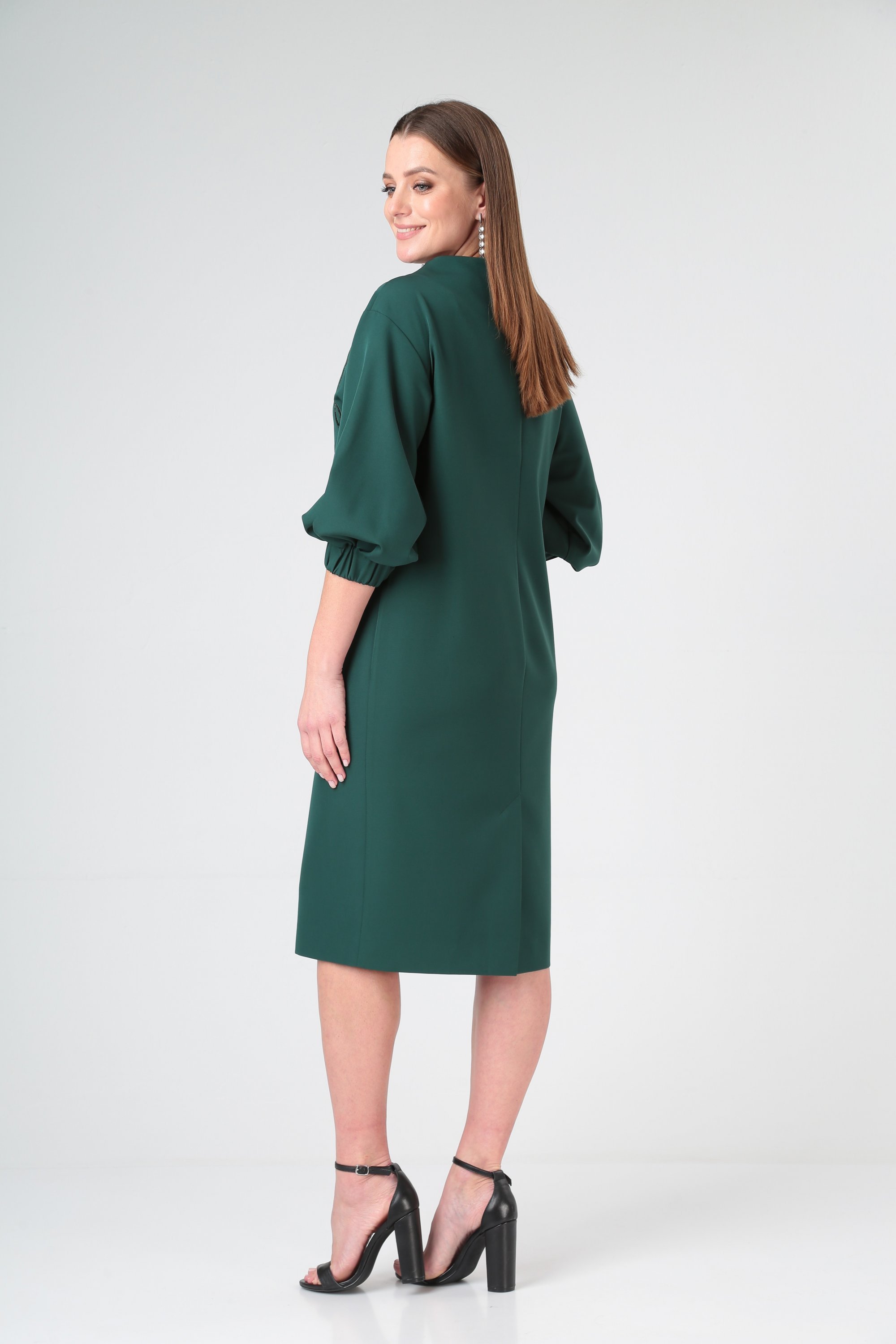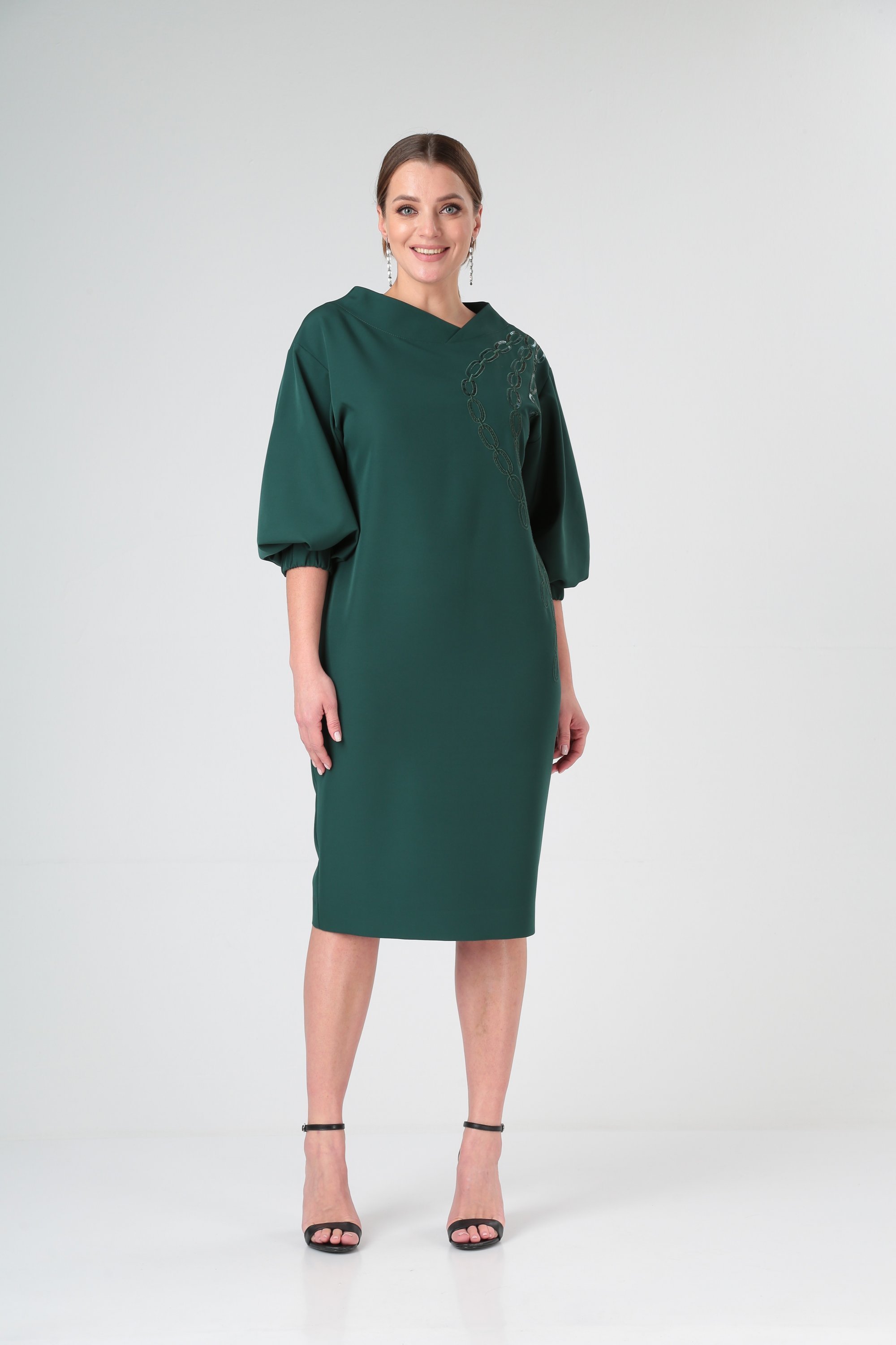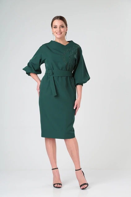 Платье полуприлегающего силуэта, со спущенным плечом, Рукав расширенный со складками по низу и манжетой с резинкой. Спинка со средним швом, в котором выполнена шлица.
