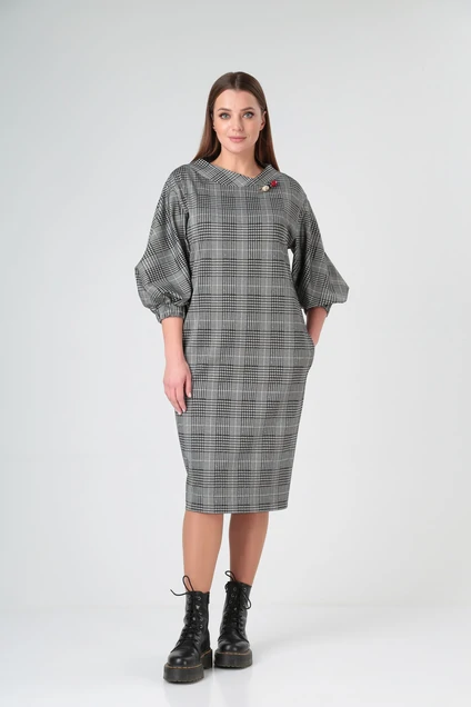 Платье полуприлегающего силуэта, со спущенным плечом, рукав расширенный со складками по низу и манжетой с резинкой. Спинка со средним швом, в котором выполнена шлица. В боковых швах карманы.