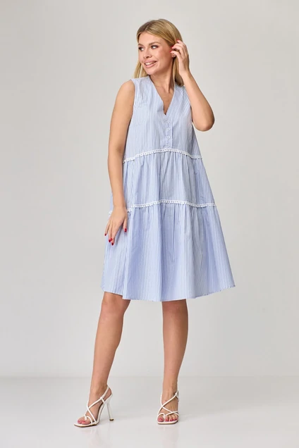 Летнее молодежное платье свободного силуэта из натуральной хлопковой ткани. Платье без рукавов, перед с застежкой на 4 пуговицы. Платье с тремя воланами, с отделкой декоративной тесьмой. Платье без подкладки.