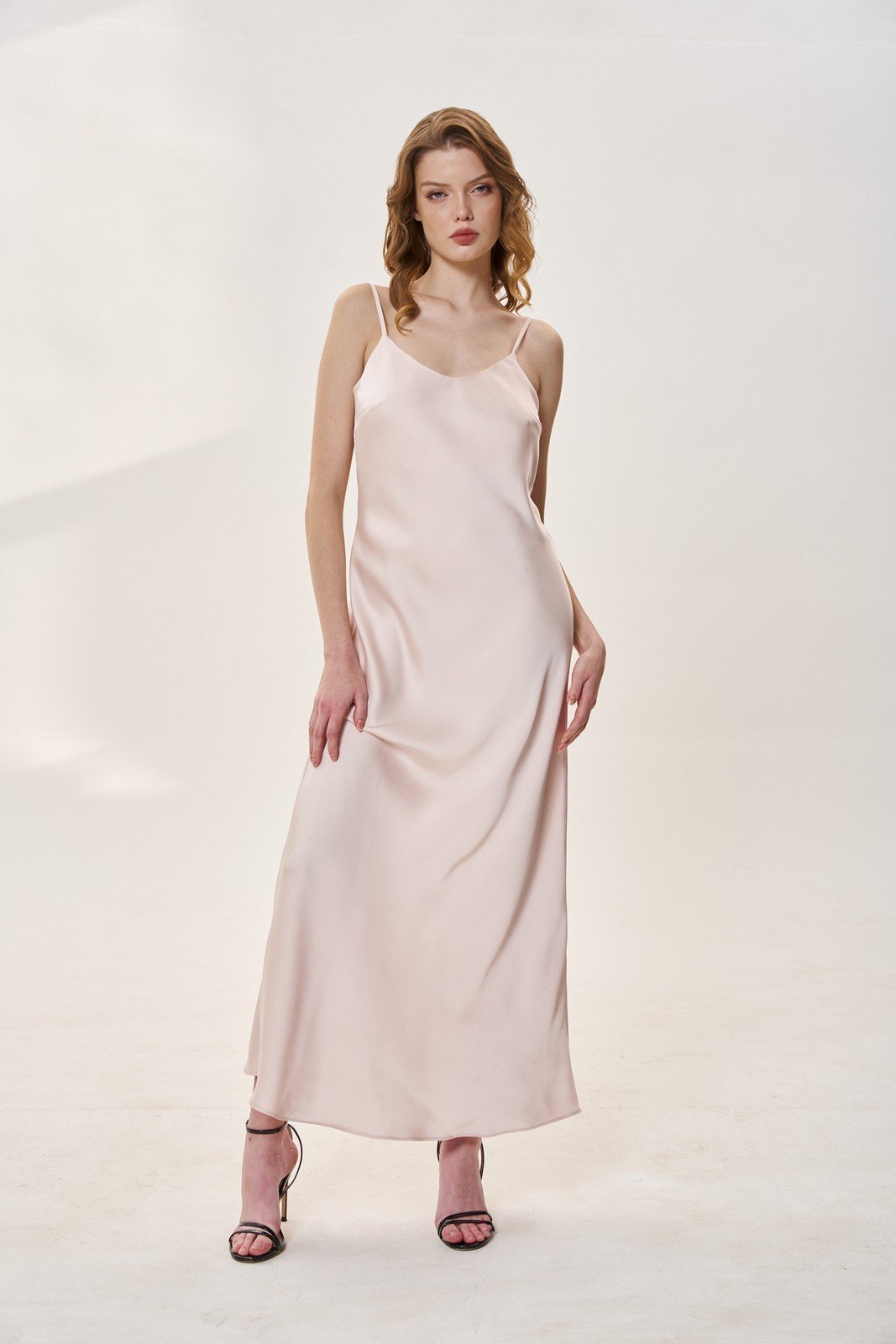 Платье-комбинация. Характеристики: выполнено из плотной шелковой ткани в жемчужном цвете, платье на регулируемых бретелях. Длина платья 134 см.