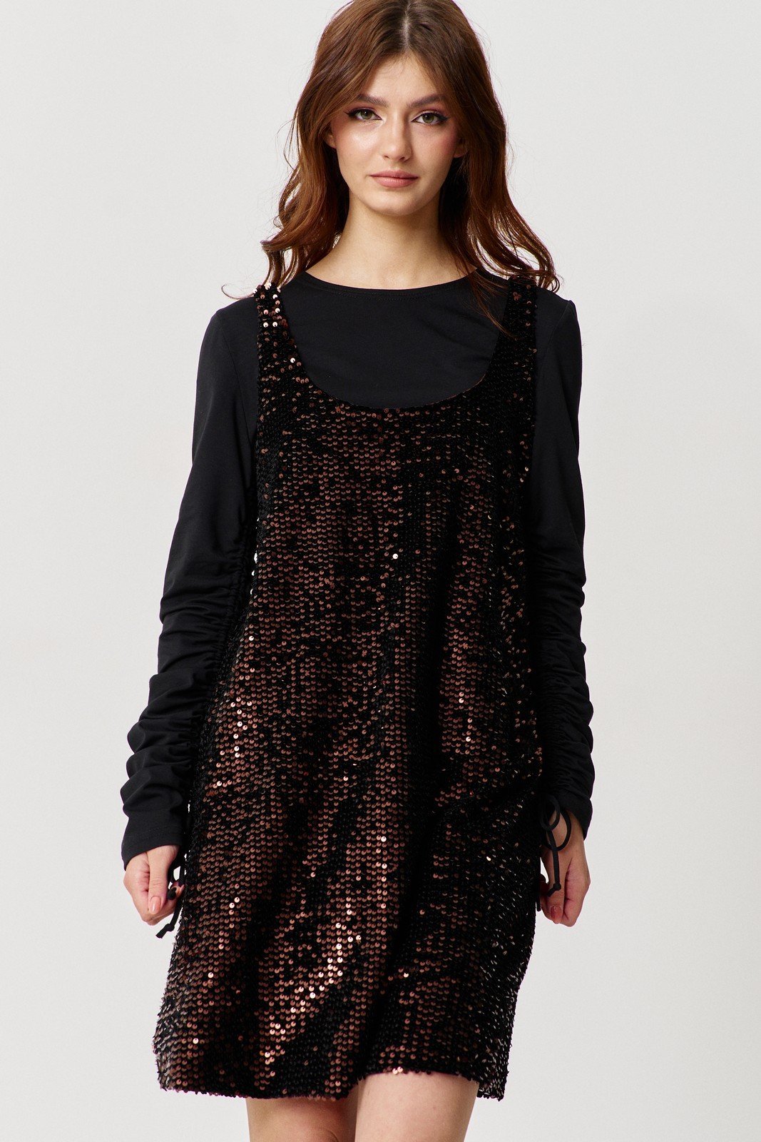 Элегантный сарафан прямого силуэта - идеальный выбор для вечернего выхода. Модель выполнена из паеточной ткани насыщенного коричневого цвета, который при свете эффектно переливается. Длина изделия составляет 88 см, что позволяет акцентировать стройность ног. Сарафан оснащен удобной подкладкой, обеспечивающей комфорт при носке. Его можно легко комбинировать с аксессуарами для создания завершенного образа на каждый случай.