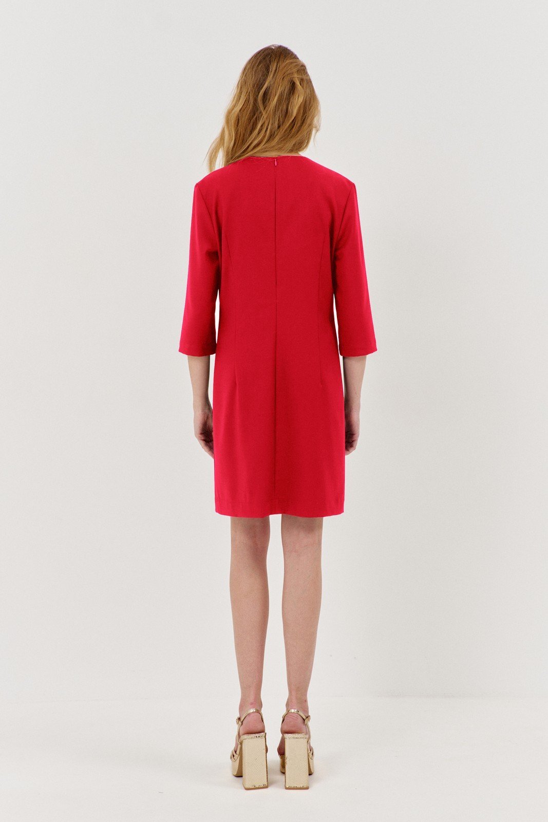 Элегантное женское платье прямого силуэта, выполненное из качественной платёной ткани насыщенного цвета горький шоколад. Дизайн платья оживлён декоративными элементами в виде шлиц по передней части, украшенных петлями и пуговицами, добавляющими изюминку образу. Задняя часть платья оформлена разрезом на потайную застежку-молнию, обеспечивающим удобство носки и аккуратный внешний вид. Длина платья составляет 90 см, а длина рукава — 41,5 см, что делает его идеальным выбором для различных повседневных и деловых мероприятий.
