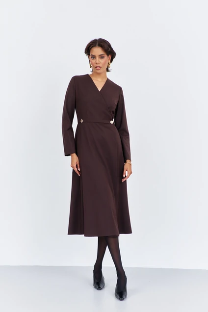 Элегантное женское платье в шоколадном цвете представляет собой идеальный выбор для создания стильного и изысканного образа. Модель выполнена из качественной плательной ткани, предлагая комфорт и эстетическое удовольствие. Платье на запах с декоративными петлями и пуговицами на передней части добавляет изысканности и уникальности дизайну. Отрезное по линии талии, оно прекрасно подчеркивает фигуру. Проработанные вытачки по передней и задней части обеспечивают идеальную посадку. Длина платья составляет 128 см, а длина рукава — 61 см, что создает элегантный и модный силуэт. Это платье — отличный выбор для важных мероприятий и деловых встреч, где требуется утонченный стиль и строгий код.