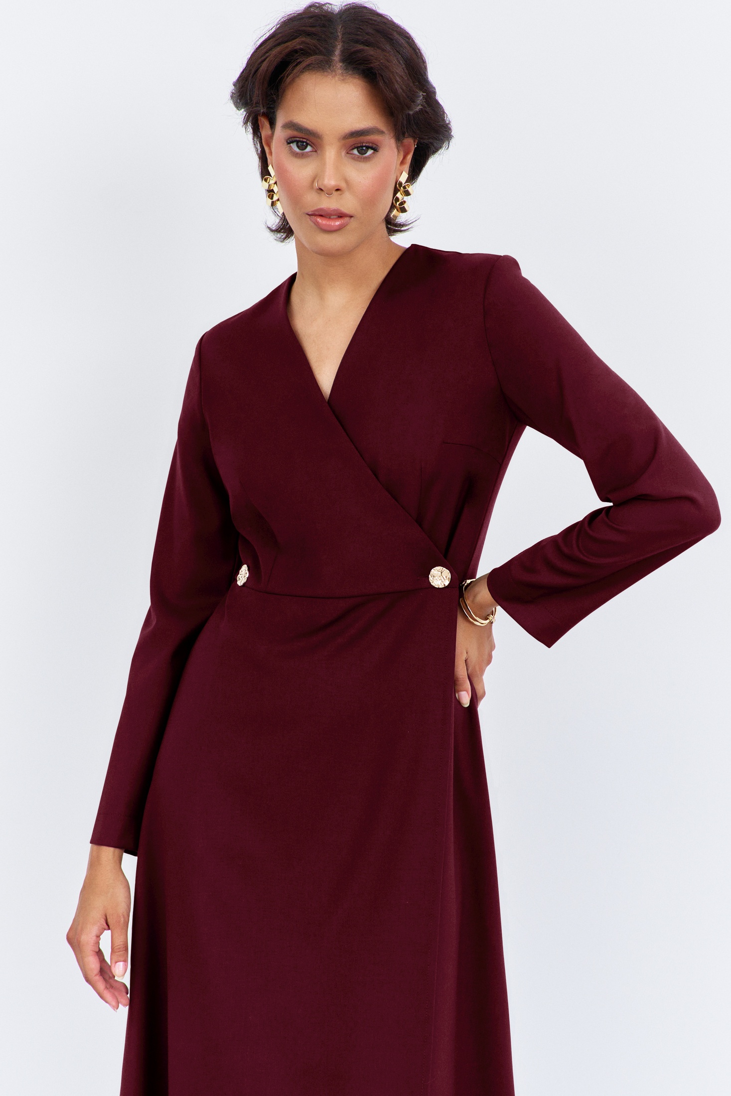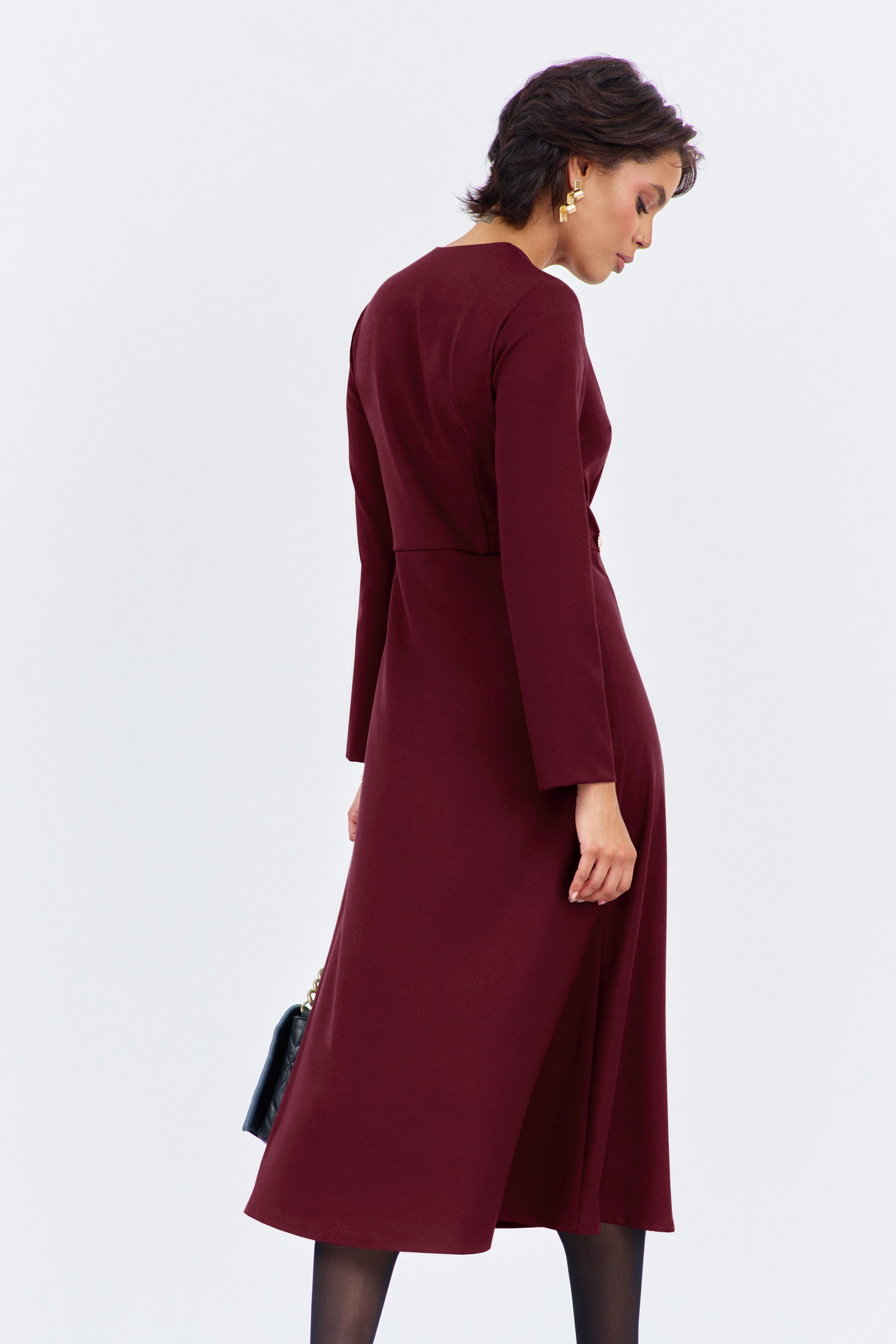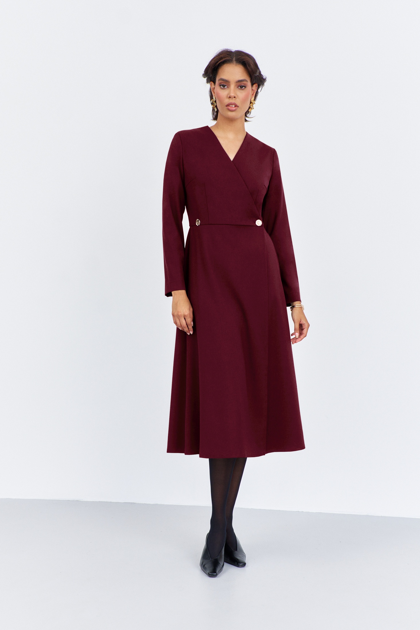 Платье приталенное на запах. Характеристики: выполнено из плательной ткани в цвете марсала, отрезное по линии талии, по переду и спинке обработаны вытачки, по переду запах на декоративные петли и пуговицы. Длина платья 128 см, длина рукава 61 см.