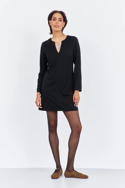 Элегантное черное платье прямого силуэта представляет собой идеальный выбор для создания стильного образа. Модель изготовлена из качественной плательной ткани. Основной акцент в дизайне делается на декоративный элемент в виде цепочки с подвеской на горловине, который придает изысканность как передней, так и задней части платья. Кроме того, на спинке предусмотрена потайная застежка-молния. Длина платья составляет 88 см, а длина рукава — 60 см, что делает модель удобной и практичной для различных событий.