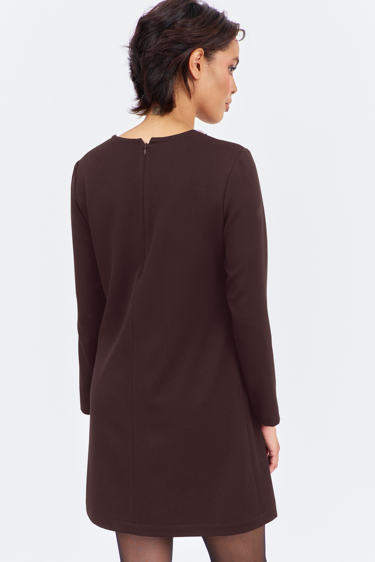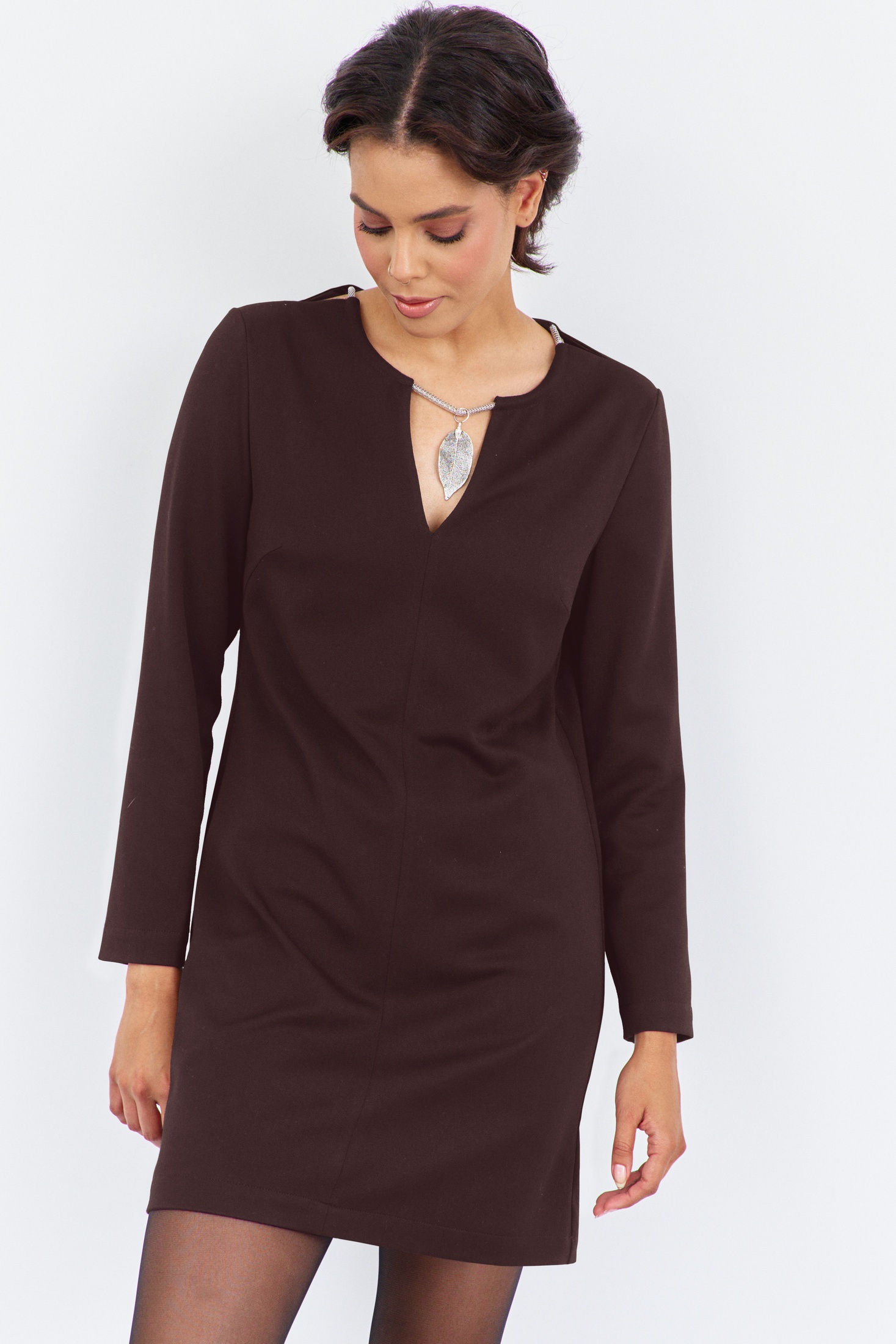 Платье прямого силуэта. Характеристики: выполнено из плательной ткани в шоколадном цвете, по горловине переда и спинки декоративный элемент с цепочкой и подвеской, спинка разрезная на потайную застежку-молнию. Длина платья 88 см, длина рукава 60 см.