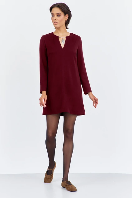 Элегантное бордовое платье прямого силуэта создаст превосходное впечатление в любой ситуации. Модель изготовлена из высококачественной плательной ткани, обладающей приятной текстурой. Особенный шарм платью придает декоративный элемент на горловине в виде цепочки с изящной подвеской, который гармонично сочетается с ансамблем. Застежка-молния незаметно расположена на спинке, подчеркивая безупречность дизайна. Длина изделия составляет 88 см, а рукава – 60 см, что делает платье универсальным выбором как для офисных будней, так и для вечерних выходов.