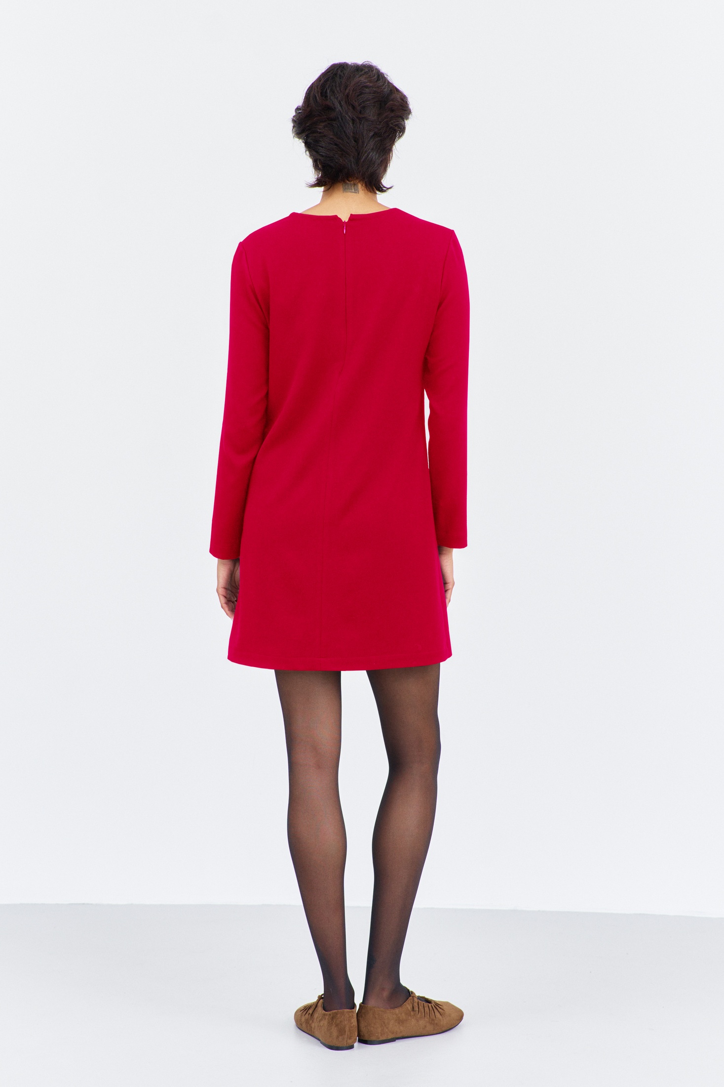Платье прямого силуэта. Характеристики: выполнено из плательной ткани в красном цвете, по горловине переда и спинки декоративный элемент с цепочкой и подвеской, спинка разрезная на потайную застежку-молнию. Длина платья 88 см, длина рукава 60 см.