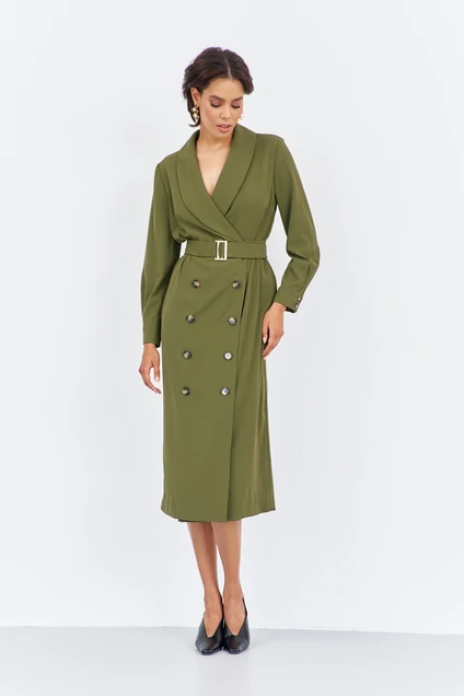 Платье прямого силуэта со смещенной застежкой. Характеристики: выполнено из плательной ткани в цвете хаки, воротник отложной - шаль, застежка-смещенная на петли и пуговицы, по рукаву манжеты на петли и пуговицы, в боковых швах карманы, по талии съемный пояс. Длина платья 127 см, длина рукава 60 см.