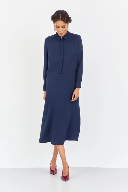 Платье прямого силуэта с потайной застежкой. Характеристики: выполнено из плательной ткани в синем цвете, отрезное по линии талии, по переду потайная застежка на петли и пуговицы, по спинке кокетка, воротник рубашечного типа, рукава на манжете. Длина платья 129 см, длина рукава 60 см.