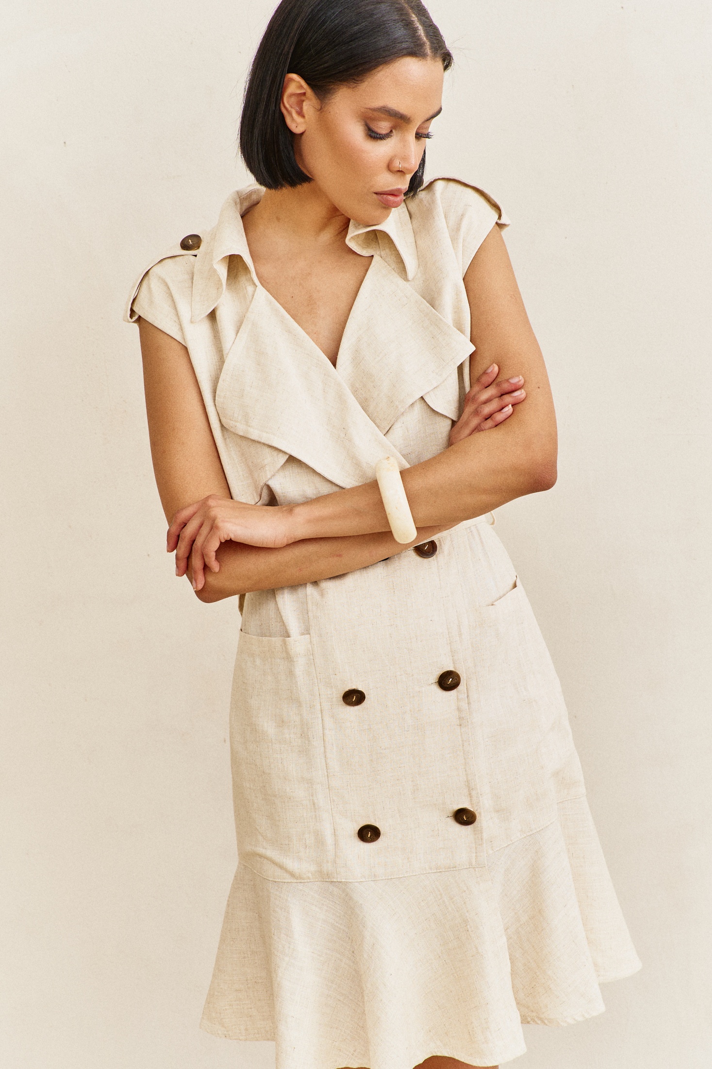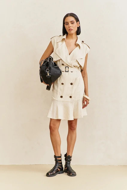 Платье 2103 бежевый FLAIM отразит вашу индивидуальность. Коллекция бренда FLAIM предлагает уникальное сочетание материалов: хлопок и лен, которые обеспечивают комфорт и легкость. Платье-тренч выполнено в стильном бежевом цвете с кокетками и воланом, что подчеркивает изящность и легкость образа. Смещенная застежка на пуговицы и съемный пояс делают модель практичной и универсальной. Идеально подходит для теплого сезона, длина по переду составляет 99 см, что делает платье подходящим для прогулок и встреч с друзьями. Станьте центром внимания, выбрав свободный фасон с воланами и отлетными кокетками.