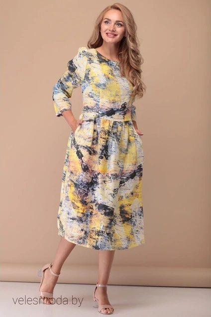 Платье из льна, полуприлегающего силуэта, отрезное по линии талии, юбкой на сборке, длиной ниже колена, с рукавами «фонарик» длиной 3\4. Спинка со швом по середине и замком-молния в нем. Перед с нагрудными и талеевыми вытачками. Рукава втачные на сборке по окату. Платье с круглой высокой горловиной. Юбка на сборке, с боковыми карманами.