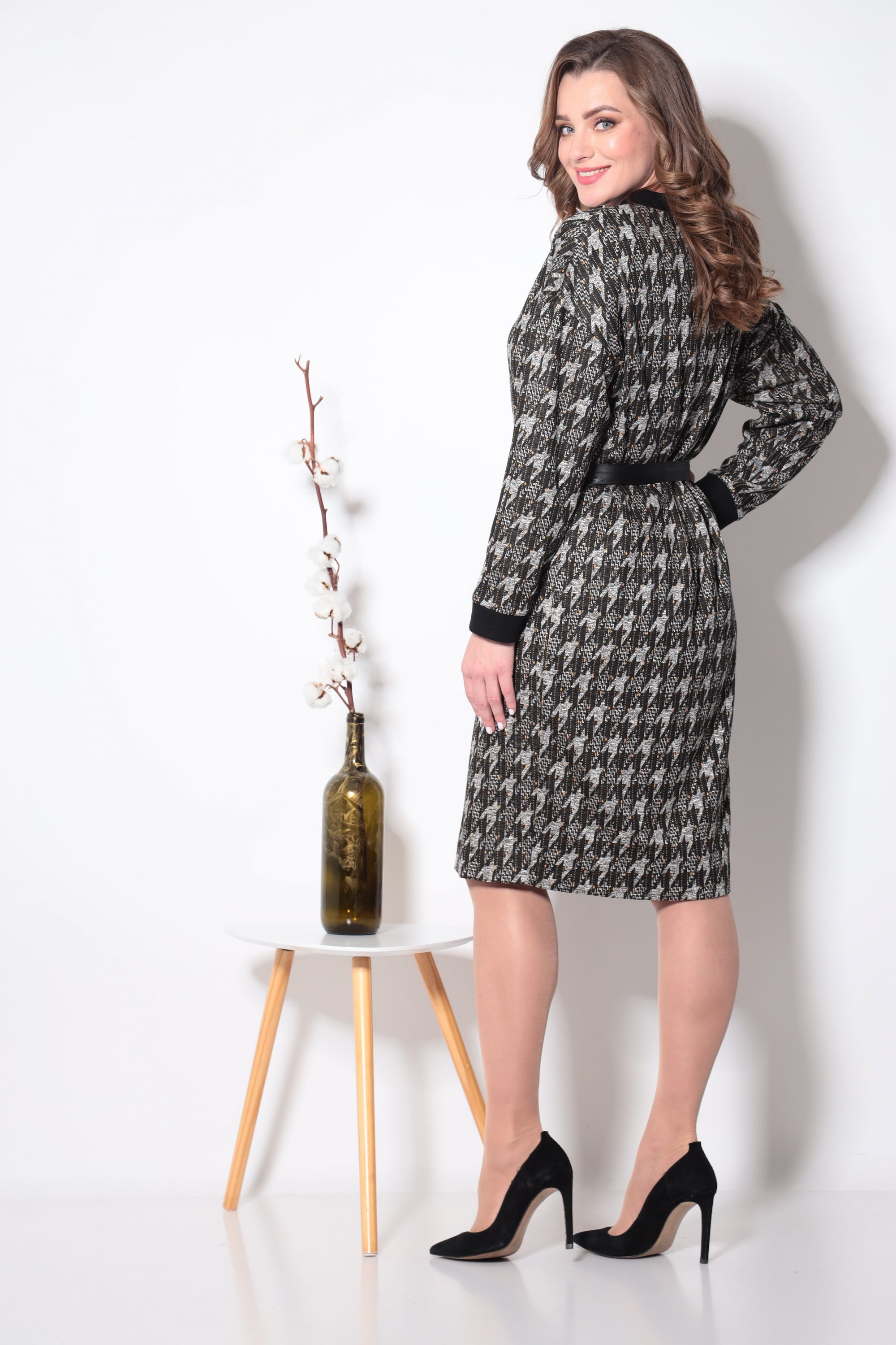 Платье женское прямого силуэта, выполнено из трикотажного полотна. Перёд и спинка цельнокраеные со спущенным плечом. Рукав длинный. Горловина и манжет выполнены из трикотажа-лапша. В комплект к платью идёт кожанный пояс, шириной 3 см., на два полукольца. Длина платья по спинке - 105 см., длина рукава от плеча - 63 см.