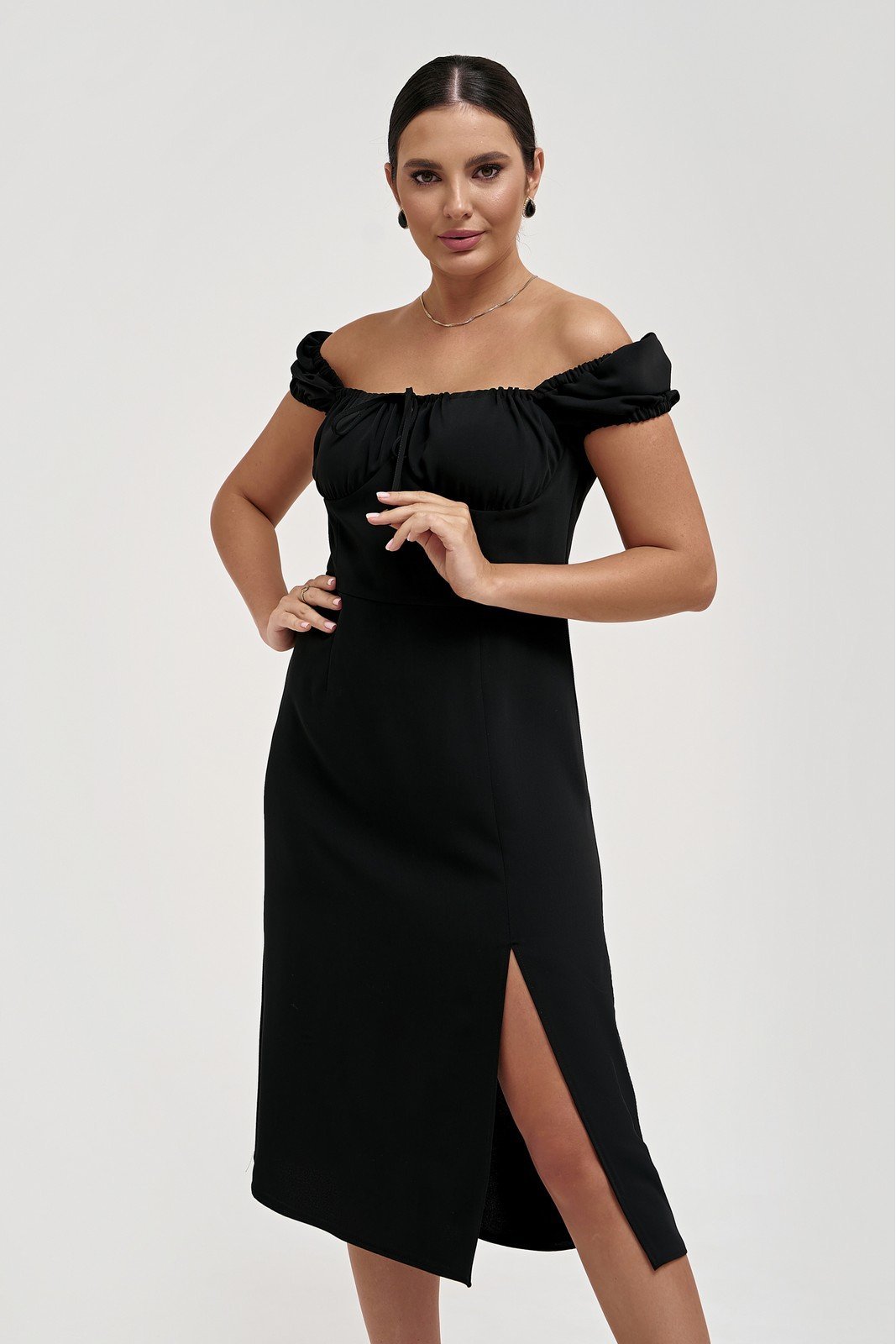 Женское платье-крестьянка полуприлегающего силуэта отрезано по линии талии. Изделие выполнено из легкой струящейся непросвечивающейся ткани без подкладки. Платье имеет втачные рукава "фонарик", которые можно регулировать по вашему желанию. Вырез горловины квадратной формы, по переду - декоративные подрезы и фиксирующие завязки, по низу - разрез, по спинке - застежка на молнию.