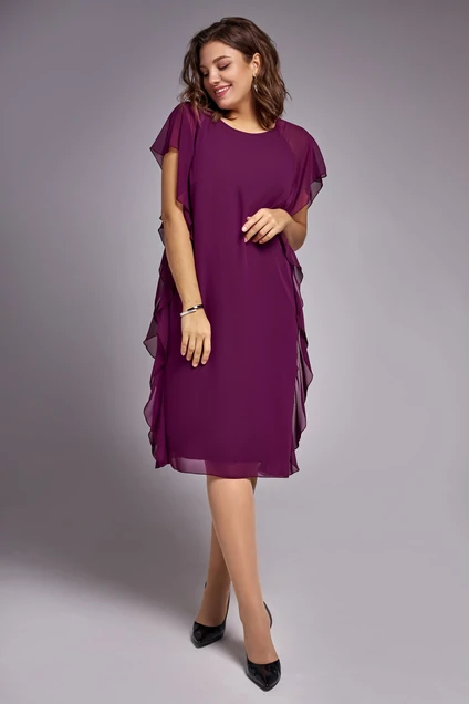 Нарядное платье прямого силуэта на эластичной подкладке, рукава реглан, переходящие в декоративные воланы по переду и спинке.