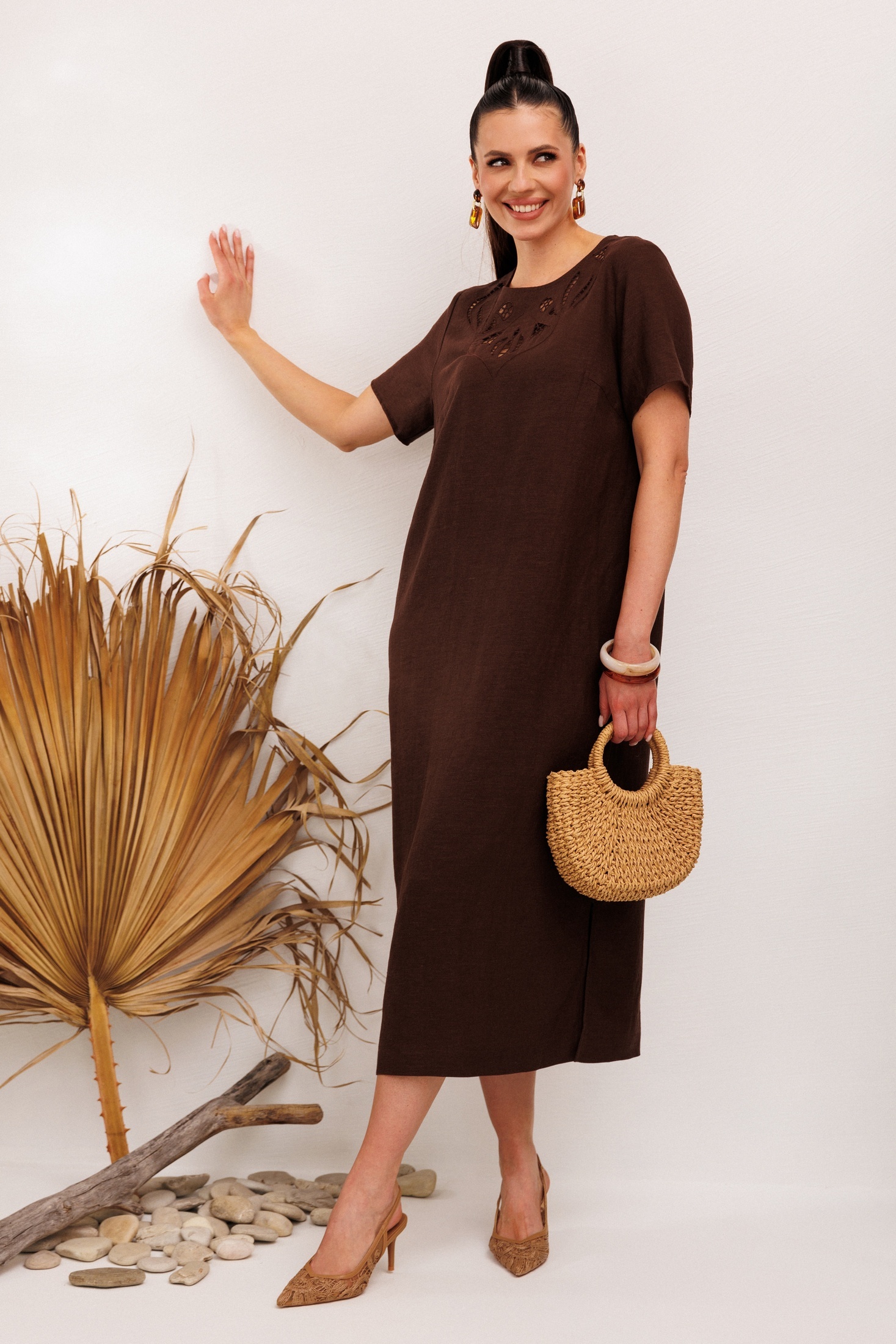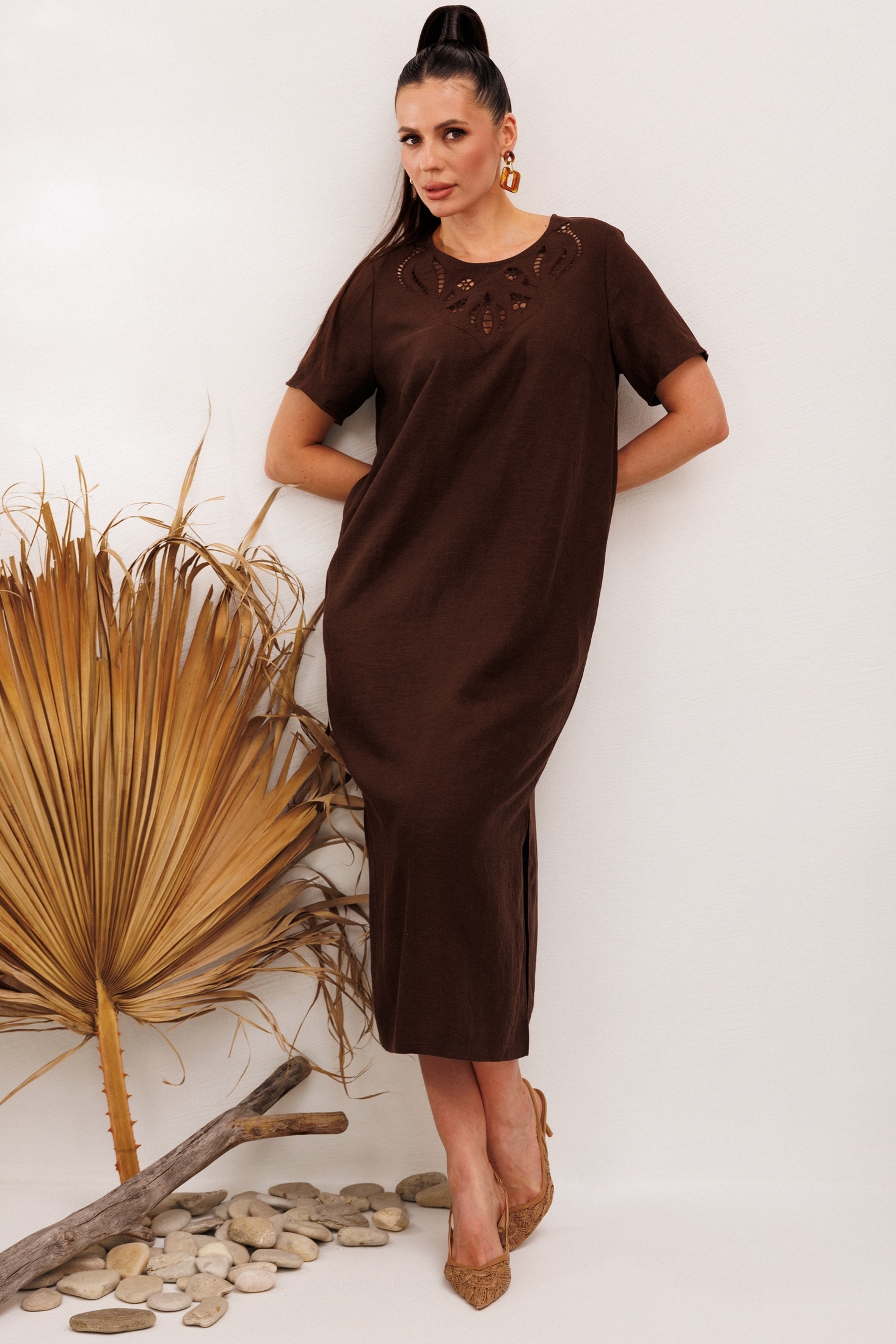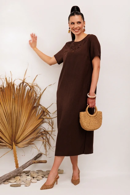 Платье 1011 коричневый Галеан Стиль — это идеальный выбор для летней жары. Коллекция бренда Галеан Стиль предлагает льняное платье с вышивкой "решелье", которое подчеркнёт вашу индивидуальность. Изготовленное из вискозы, это платье средней длины обеспечивает комфорт и стиль на каждый день. Прямой силуэт, оформленный дизайнерской вышивкой и разрезами по бокам, делает его идеальным для дневных прогулок и летних выходов. Коричневый цвет добавляет глубину образу, позволяя сочетать его с разнообразными аксессуарами.