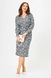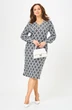 Платье женское, трикотажное полуприлегающего силуэта. v-образным вырезом по переду.Со средним швом заканчивающиеся разрезом.Рукава прямые собирающиеся с низу на манжет. Платье длиной ниже линии колена. На манжетах нашиты 4 декоративные пуговицы. Длина 110 см, рукав 62 см.