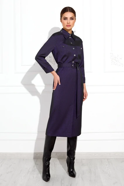 Платье прямого силуэта. Полочка разрезана по центру, внизу обработана шлица, в верху застежка в виде планки на пять петель и пуговиц. Полочка с двумя нагрудными вытачками. В области груди настрочены два кармана, на которые пришиты отделочные пуговицы. Отложной воротник на стойке. По полочке и спинке притачена кокетка. Спинка цельнокроеная со встречной складкой по кокетке. Рукав одношовный, четвертной с застроченной и заутюженной манжетой. К платью прилагается ремень с обтянутой пряжкой из основной ткани. Фурнитура может быть изменена. Длина изделия 115см, рукава 48см.