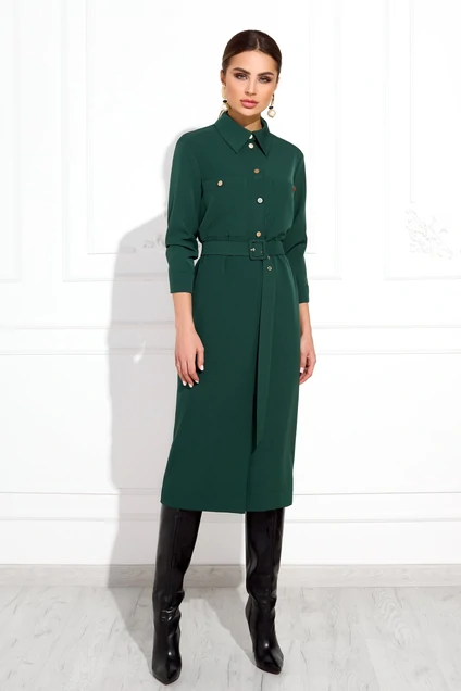 Платье прямого силуэта. Полочка разрезана по центру, внизу обработана шлица, в верху застежка в виде планки на пять петель и пуговиц. Полочка с двумя нагрудными вытачками. В области груди настрочены два кармана, на которые пришиты отделочные пуговицы. Отложной воротник на стойке. По полочке и спинке притачена кокетка. Спинка цельнокроеная со встречной складкой по кокетке. Рукав одношовный, четвертной с застроченной и заутюженной манжетой. К платью прилагается ремень с обтянутой пряжкой из основной ткани. Фурнитура может быть изменена. Длина изделия 115см, рукава 48см.
