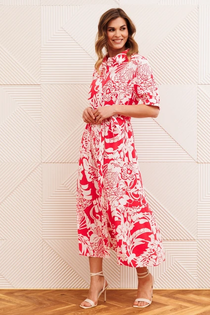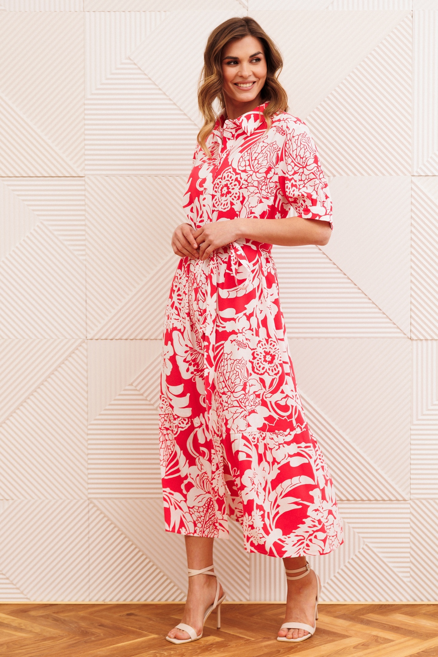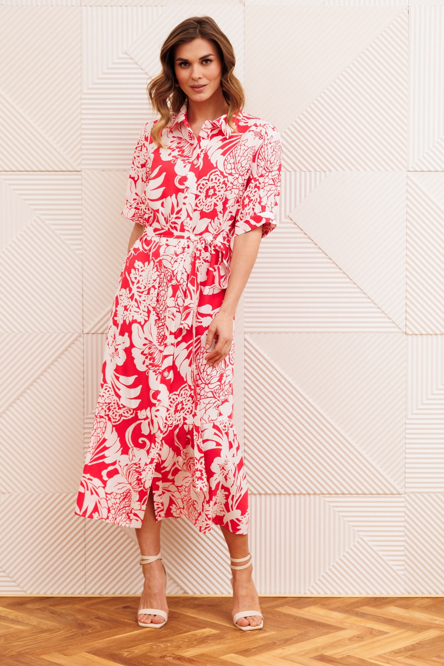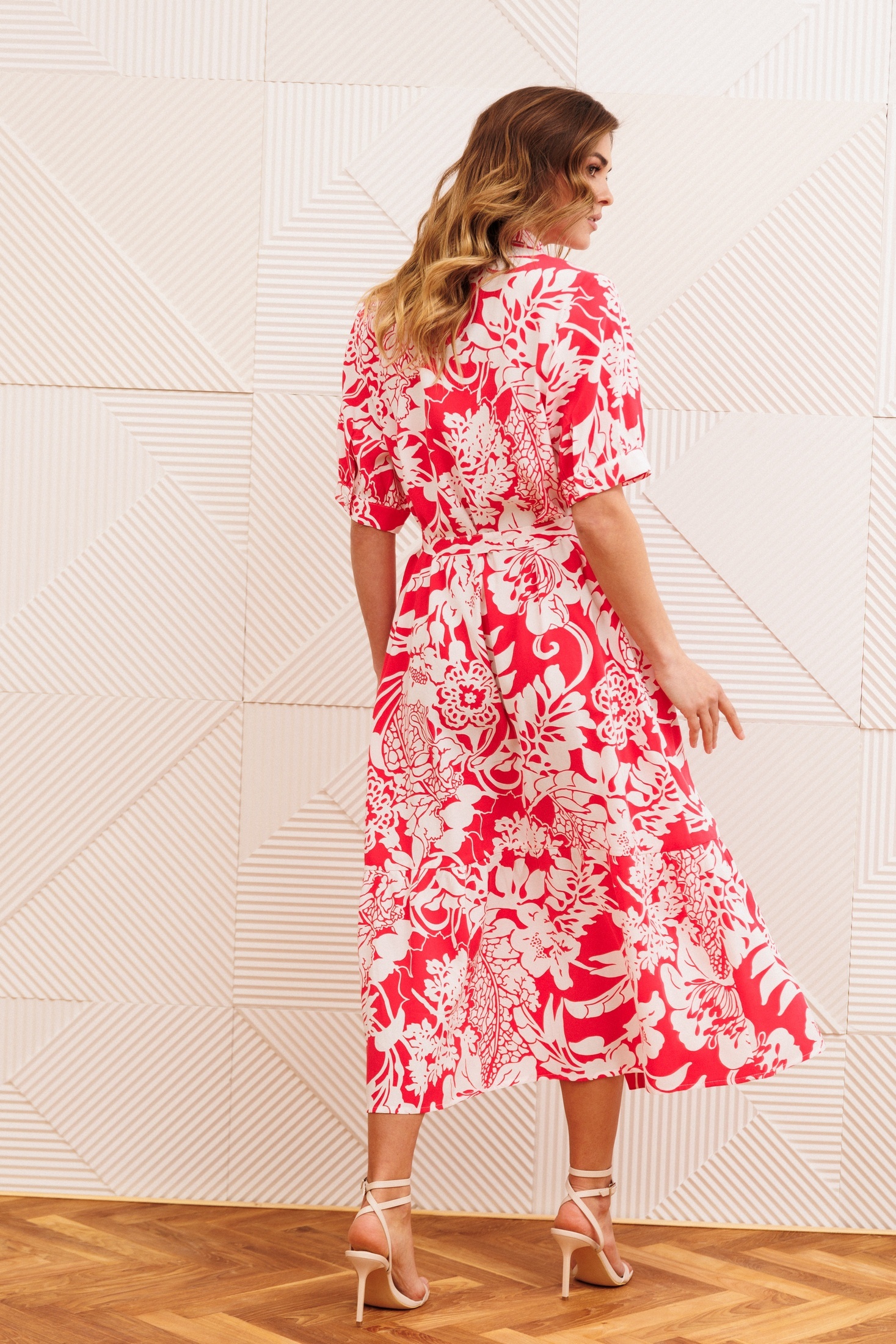 Платье 5126-2 коралл цветы GIZART привлекает внимание своим ярким летним дизайном и неповторимым стилем. Коллекция бренда GIZART предлагает это изящное платье А-образного силуэта, выполненное из нежной вискозной ткани. Платье дополнено рубашечным воротником и застежкой на пуговицах, что придаёт ему лёгкость и комфорт. Цветочный принт и коралловая расцветка делают его идеальным для летних выходов. Съёмный пояс подчеркивает талию, а длина по спинке 127 см обеспечивает комфорт в жаркие дни. Это универсальное платье отлично подойдет как для повседневных прогулок, так и для праздничных мероприятий. Длина рукава 29 см создает легкость и непринужденность образа.