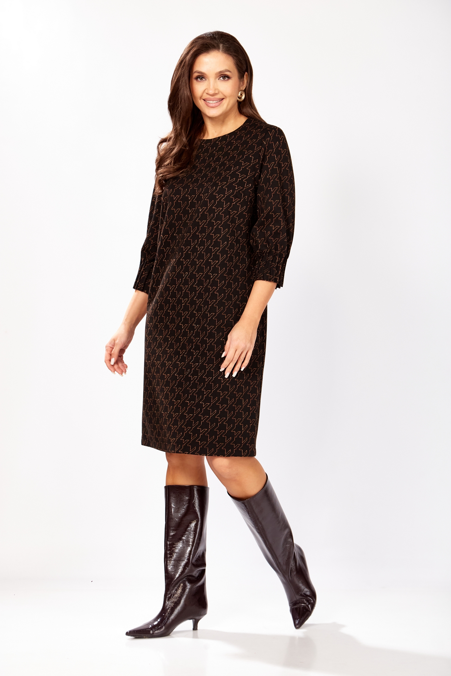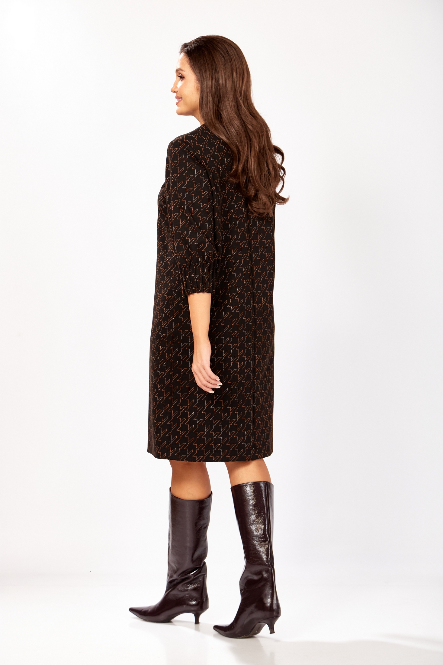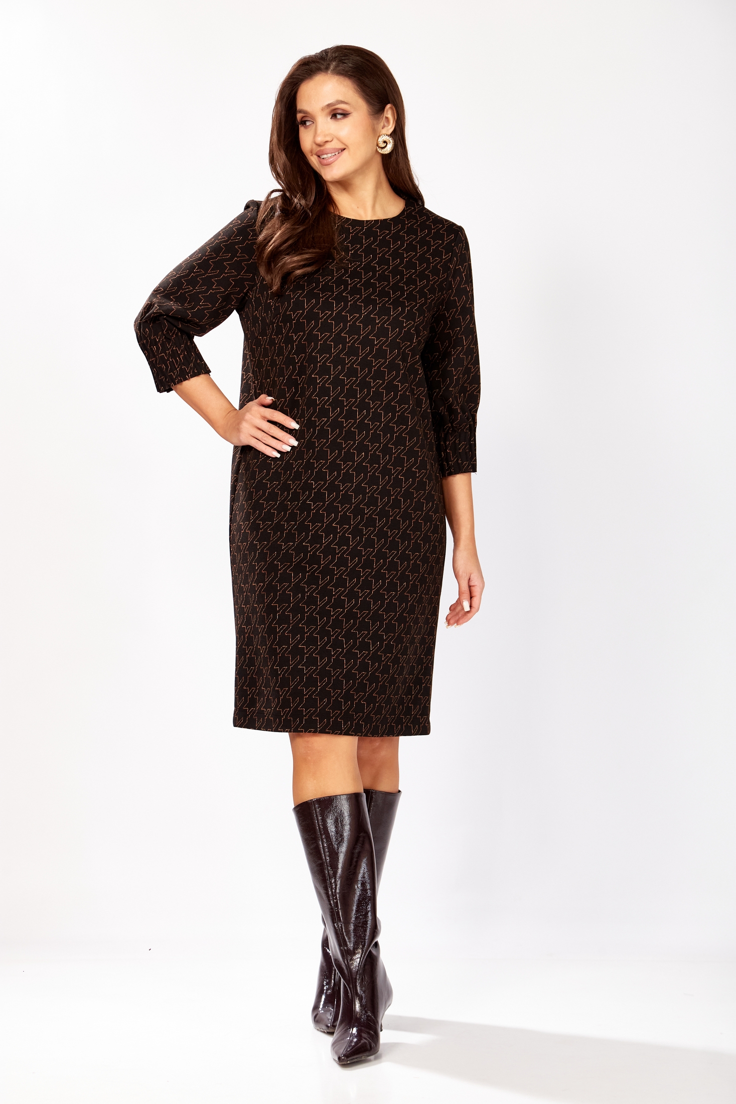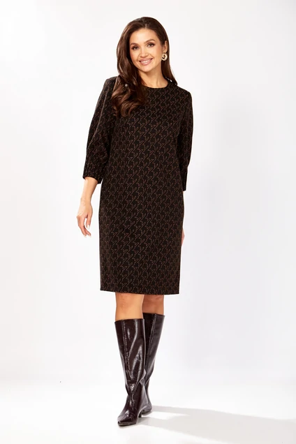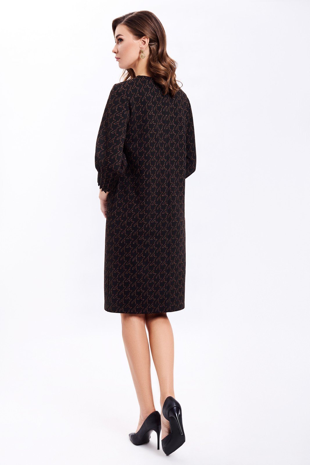 Платье прямого силуэта из трикотажной ткани. Перед с нагрудными вытачками из бокового шва. Спинка со средним швом, вверху шва обработан разрез с застежкой на петлю и пуговицу. Рукав одношовный втачной, по низу застрочены защипы. Длина спинки по среднему шву-100см, длина рукава-45см.