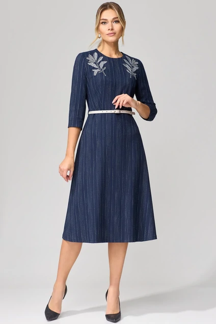 Платье полуприлегающего силуэта, отрезное по линии талии. Перед с двумя талиевыми вытачками. Спинка со средним швом вверху с молнией, и двумя талиевыми вытачками. Рукав двухшовный четвертной. Юбка расширенная книзу. В боковых швах шлевки. В верхней части лифа платье декорировано вышивкой. К платью прилагается съемный ремень. Длина изделия 113 см, длина рукава 45 см.